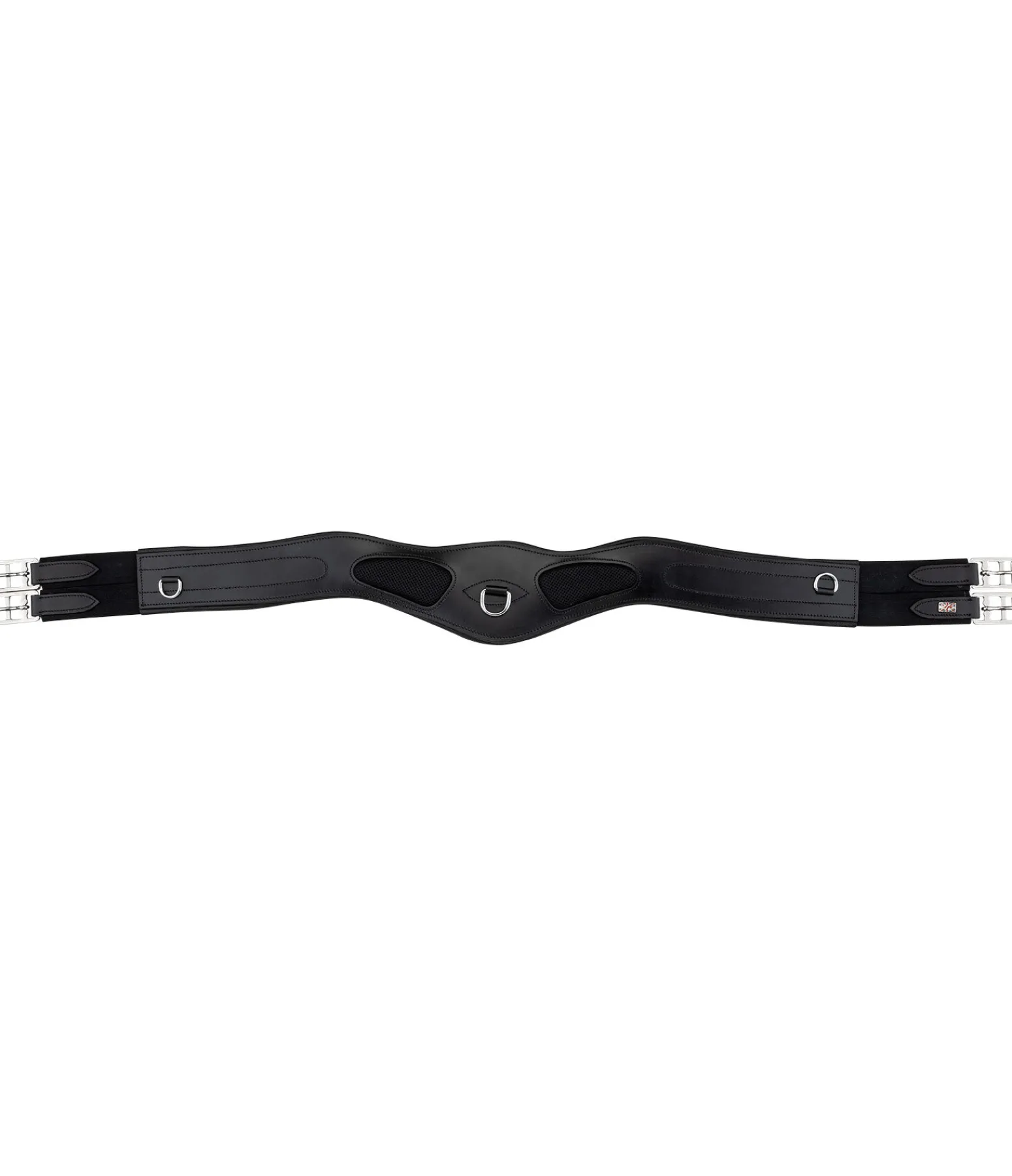 Sangle en cuir anatomique avec doublure douce. Trois anneaux en D, empiècements élastiqués des deux côtés et boucles à rouleau. Largeur de la sangle 8,5 à 13 cm.