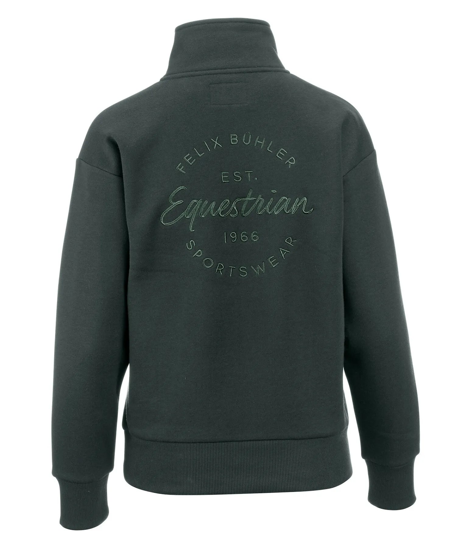 Sweat basique avec col montant zippé. Coton stretch de qualité supérieure, finition bord-côte doux en bas des manches et à la taille. Grande broderie ton sur ton Felix Bühler dans le dos. 65 % polyester, 35 % coton.