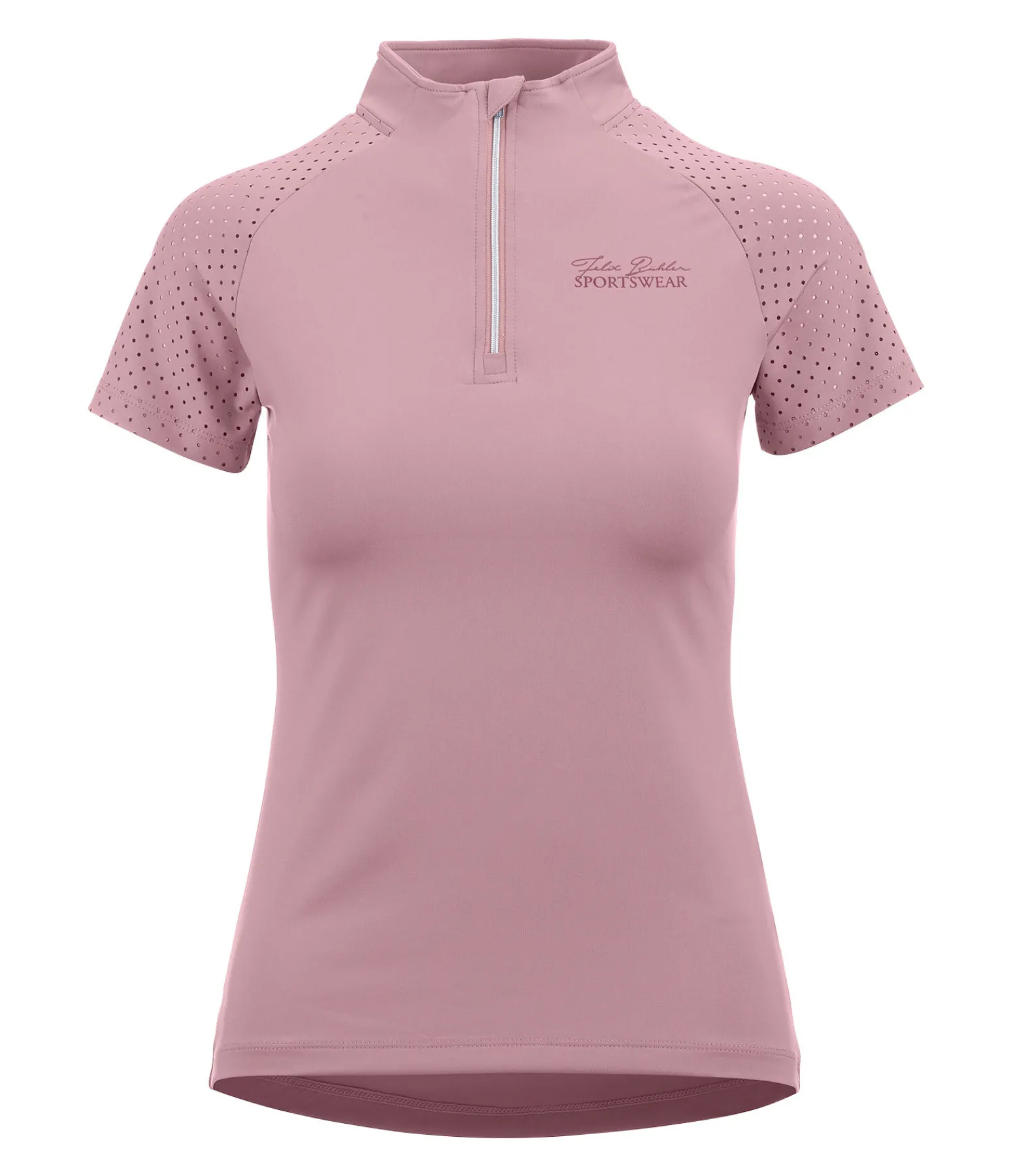 T-shirt à manches courtes, technique et sportswear. Tissu respirant à séchage rapide. Manches raglan et haut du dos ajourés grâce à une découpe laser. Col montant zippé avec protège-menton. Signature Felix Bühler en silicone sur la poitrine et le col. 88 % polyester, 12 % élasthanne.