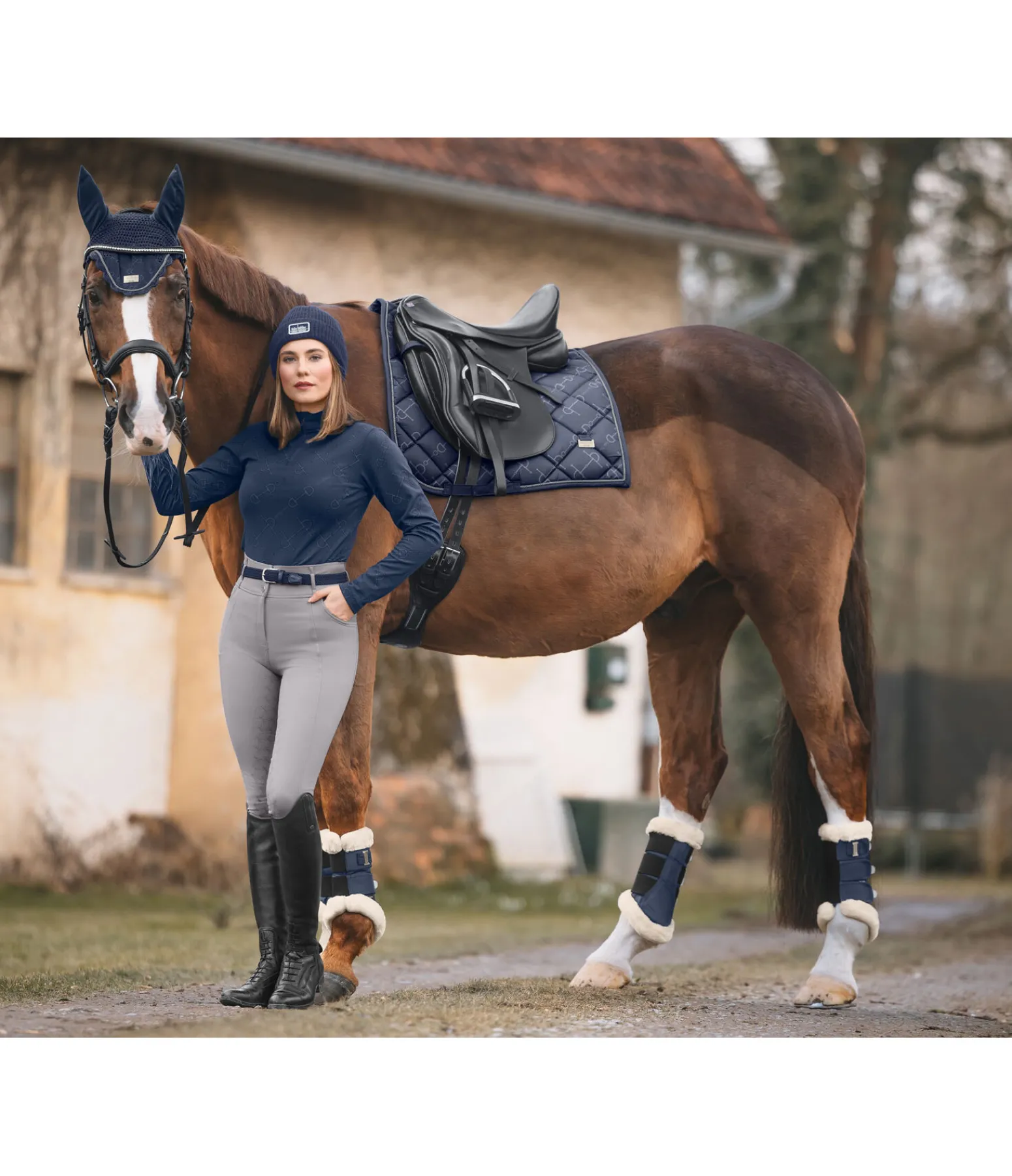 Élégant tapis de selle de forme carrée avec plaque logo métallique de chaque côté. Cordon décoratif anthracite et imprimé all-over discret à motif mors tendance. Passants de sangle et de contre-sanglons avec pattes auto-agrippantes pratiques. Dessous en Air mesh respirant et absorbant l’humidité. 100 % polyester.