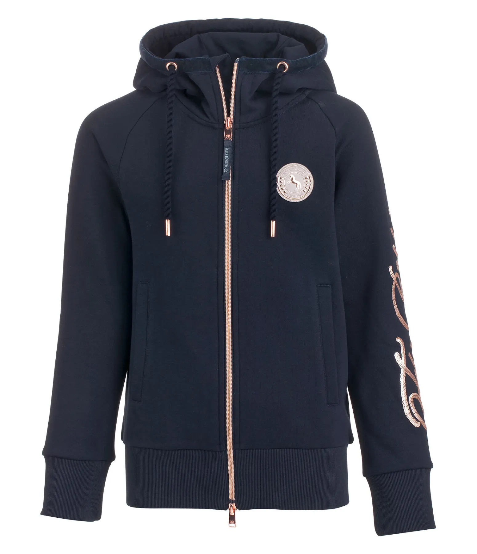Veste sweat sportswear en coton stretch. Badge Felix Bühler sur la poitrine et inscription Felix Bühler rose doré scintillante. Capuche réglable ornée d’un ruban de velours et d’un cordon torsadé. Intérieur molletonné. Fermeture à glissière double sens rose doré avec sous-patte et protège-menton. Deux poches latérales. Bord-côte sur le bas des manches et la taille. 60 % coton, 40 % polyester.