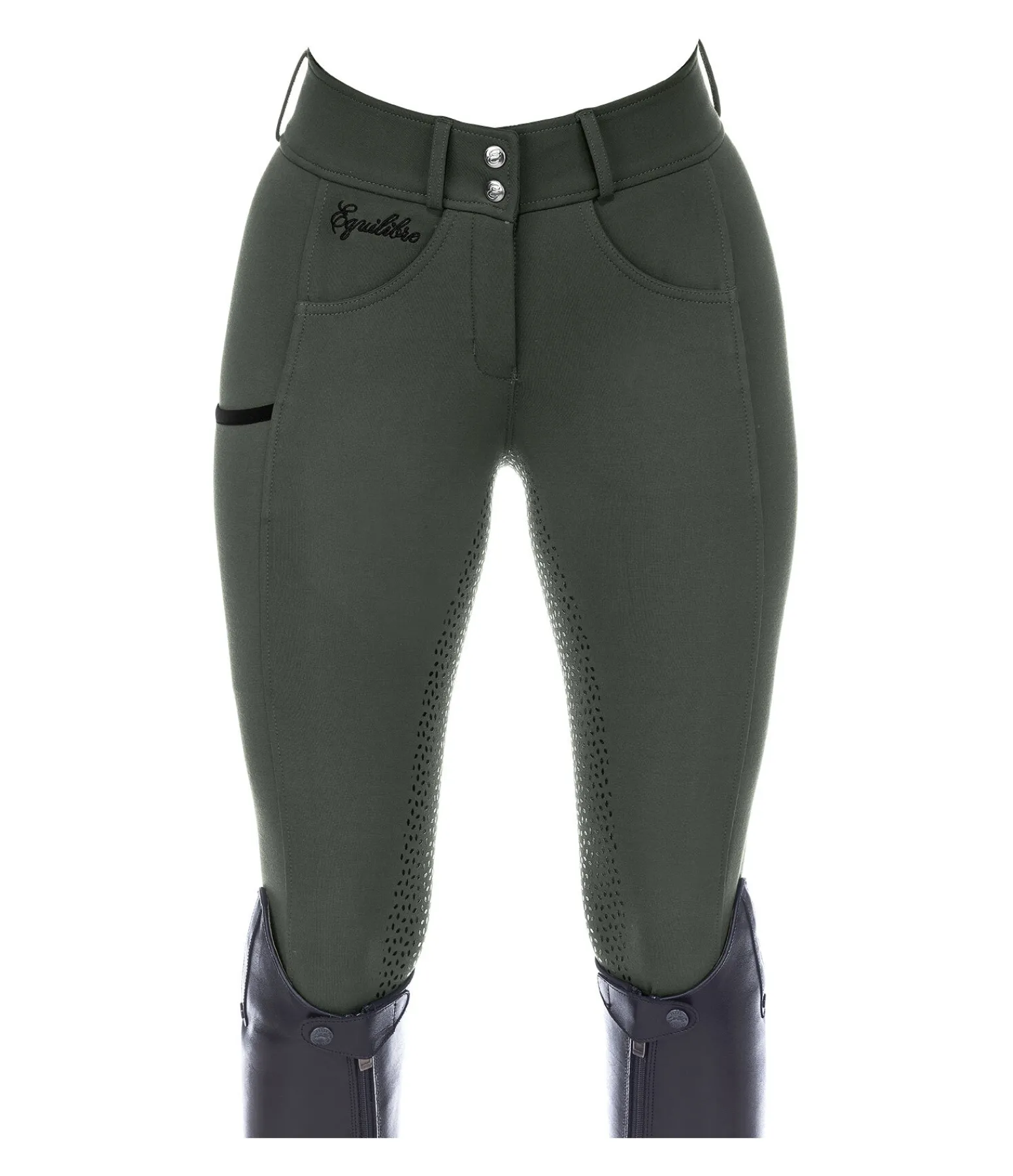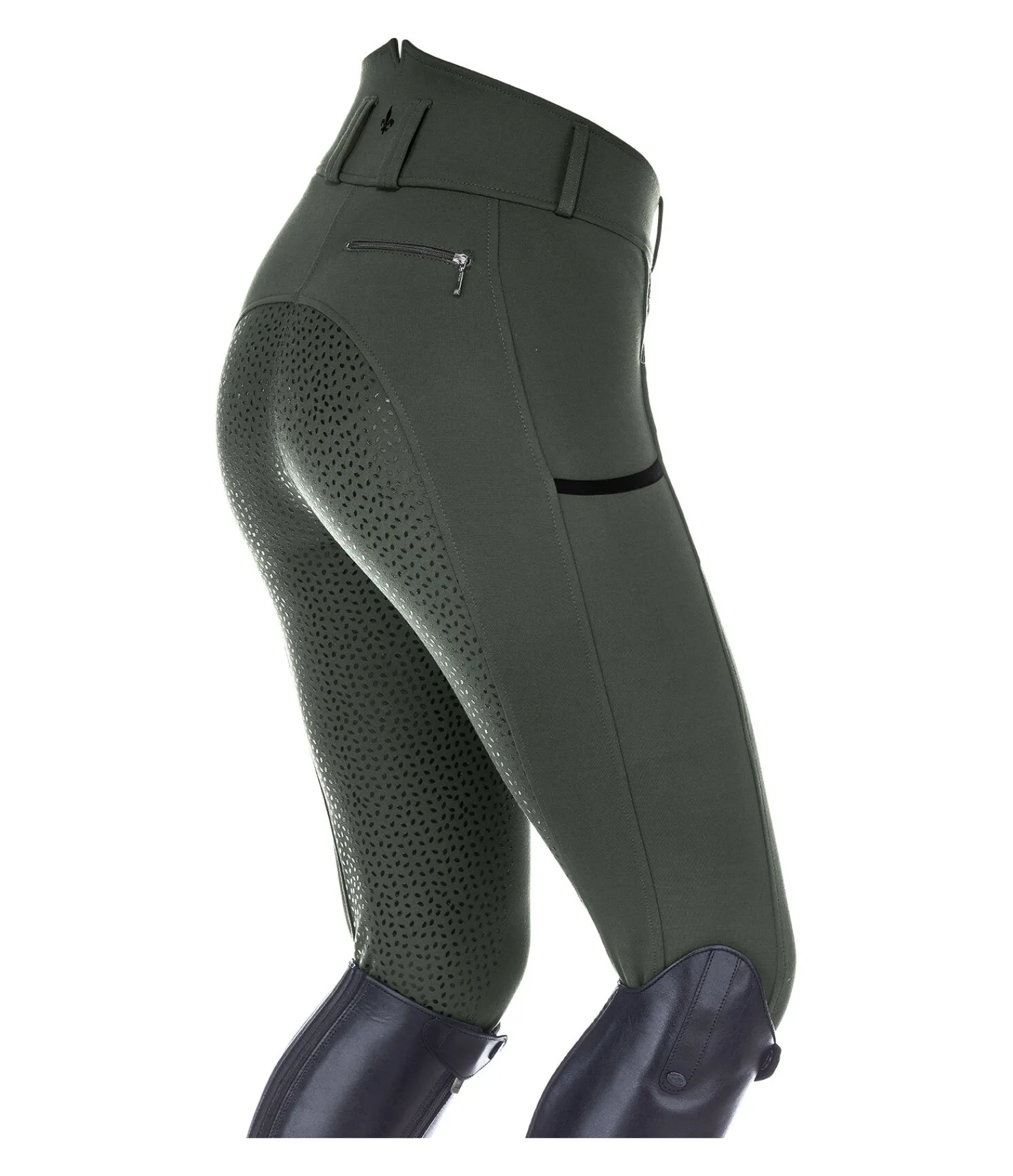 Pantalon d’équitation taille haute. Matière souple super confortable et extensible. Fond intégral grip en silicone. Aucune couture au niveau des genoux. Une poche latérale pour téléphone portable et une poche arrière zippée. Broderie sur l’avant et l’arrière. Bas de jambe extensible sans patte auto-agrippante. 68 % viscose, 27 % nylon, 5 % élasthanne.
