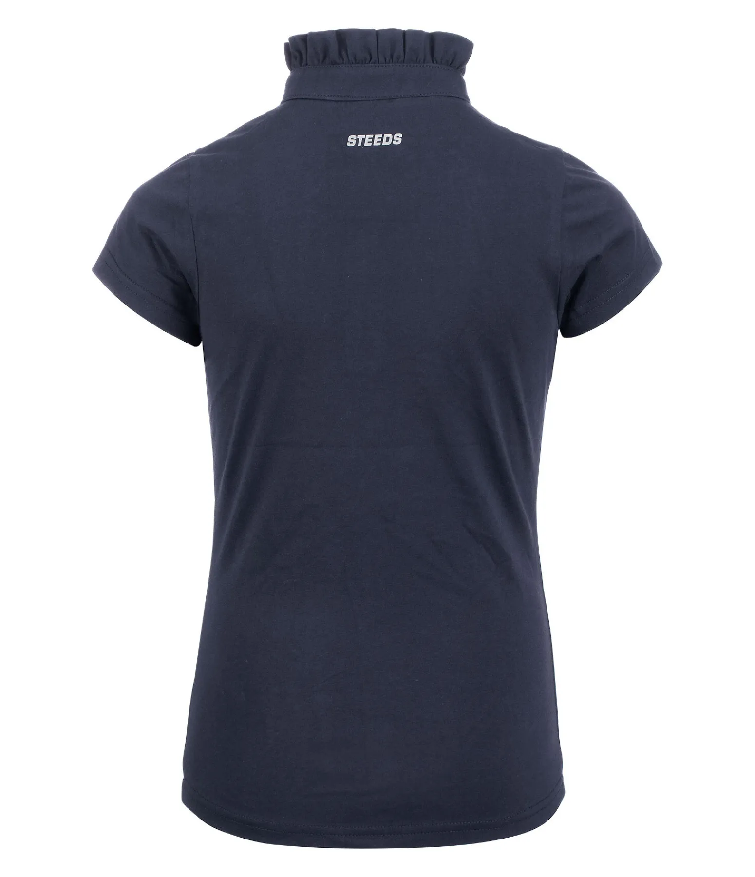 Polo d’équitation à manches courtes en jersey de coton doux et extensible. Col montant froncé. Patte de boutonnage argentée. Motif cheval argenté sur la poitrine. Logo STEEDS au dos. 75 % coton, 25 % polyester.