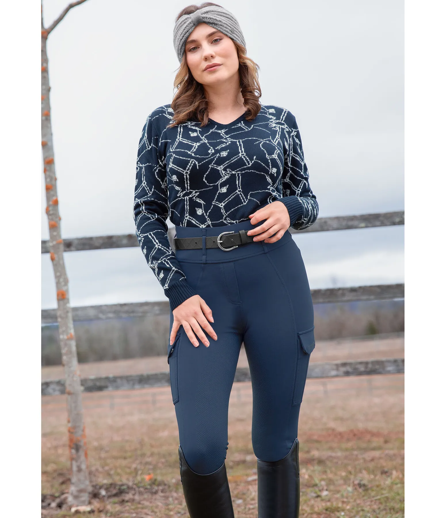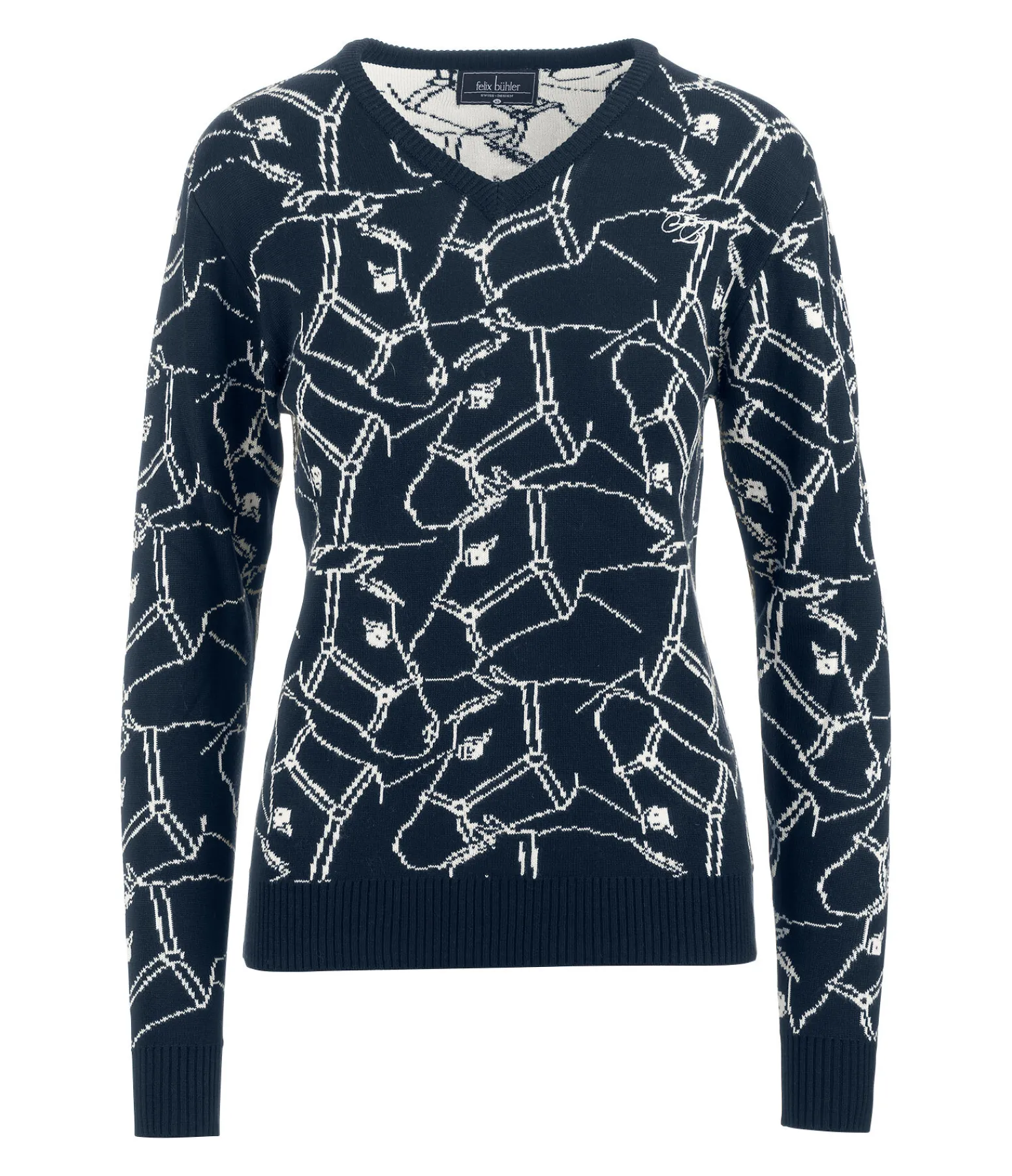 Pull col V doux, tissé en jacquard avec imprimé cheval. Logo brodé sur la poitrine. Finition en bord-côte sur le col, le bas des manches et l’ourlet. 55 % viscose, 45 % polyacrylique.