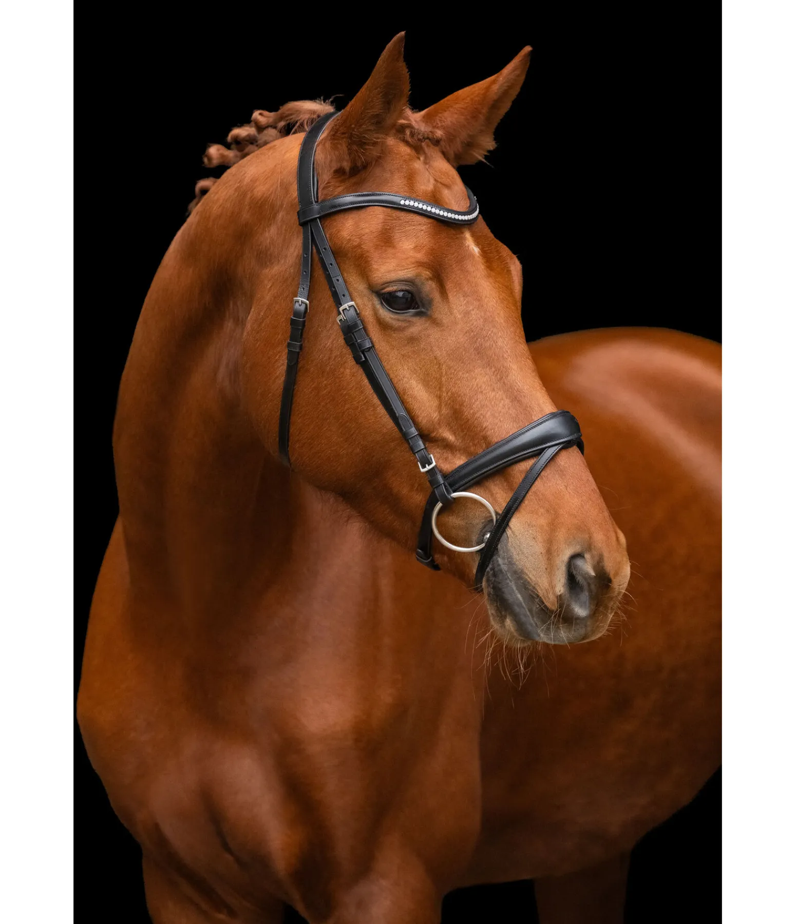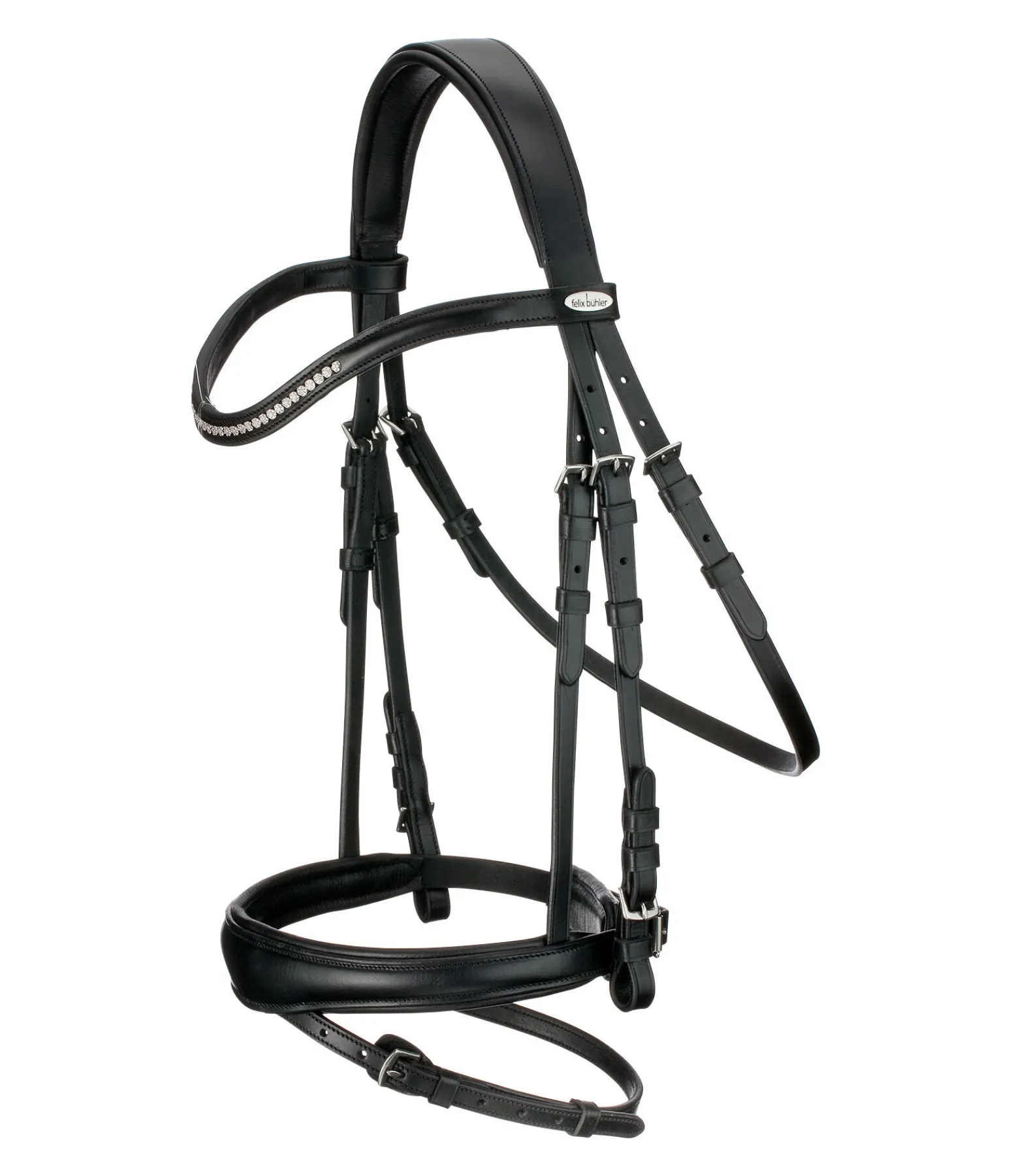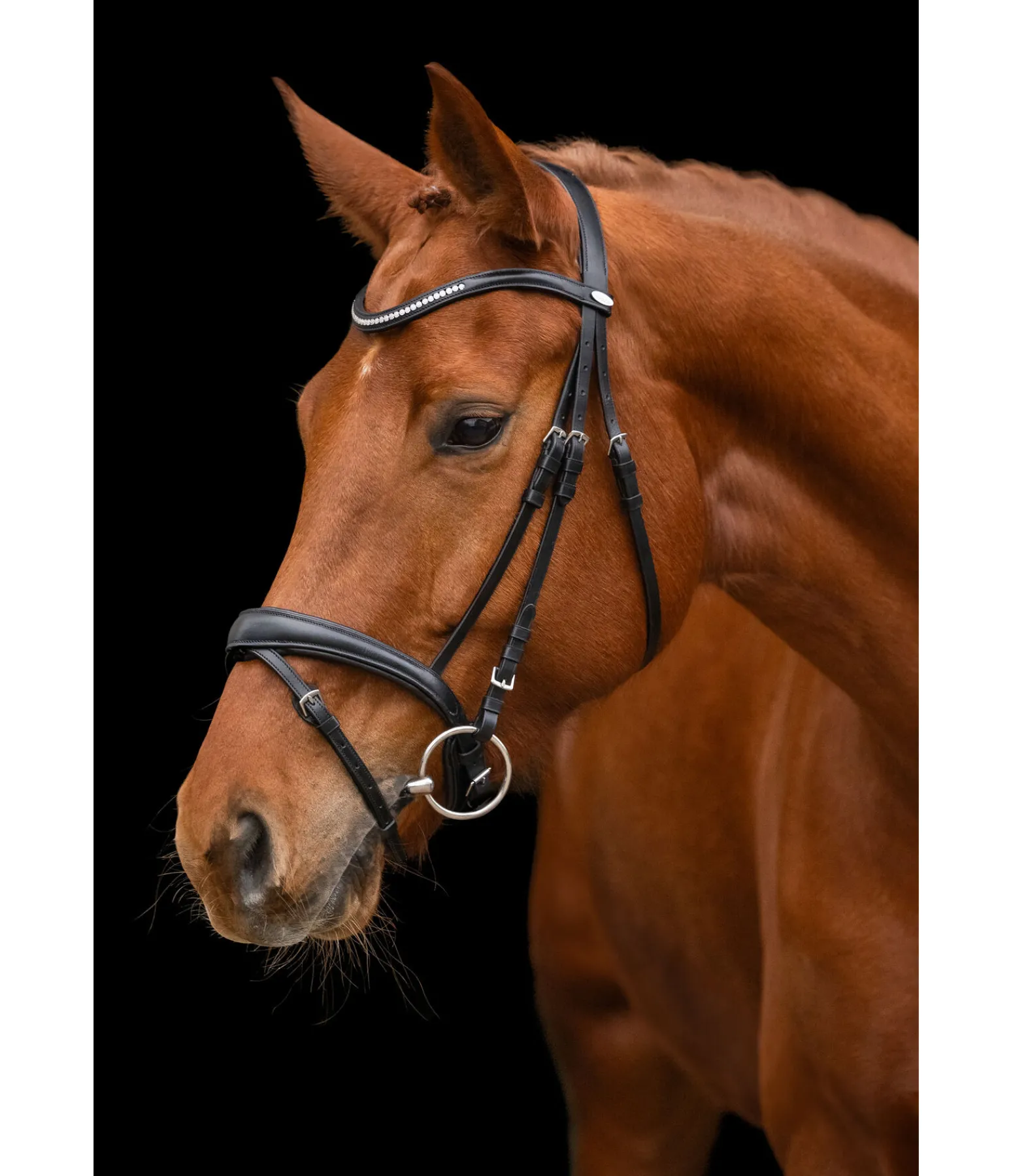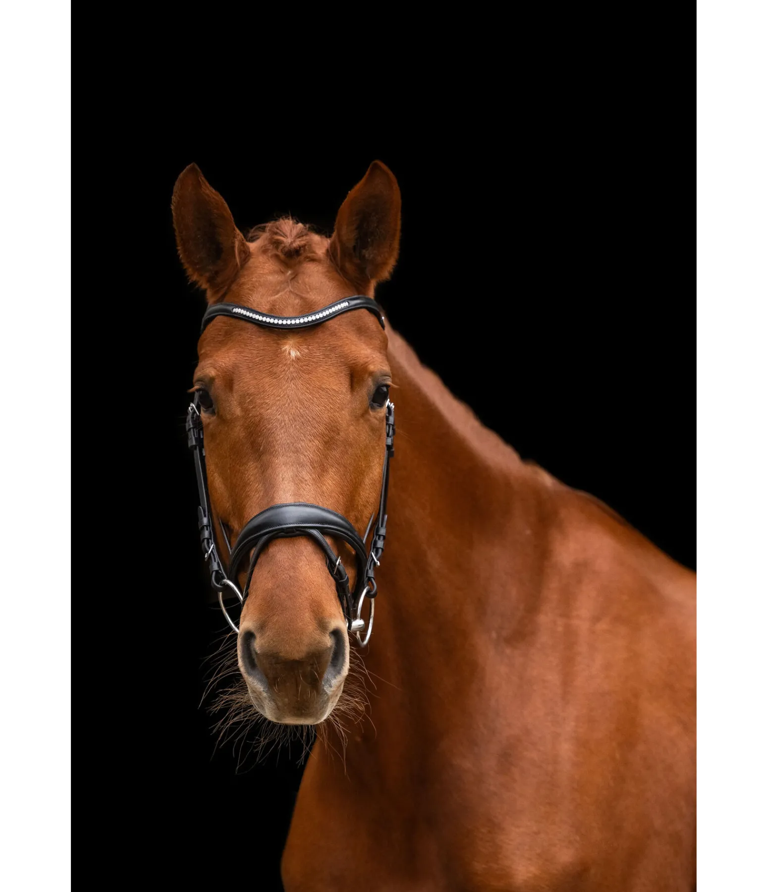 Muserolle française combinée classique en cuir véritable souple. Muserolle extra rembourrée. Noseband entièrement amovible. Têtière anatomique et frontal vague avec strass.