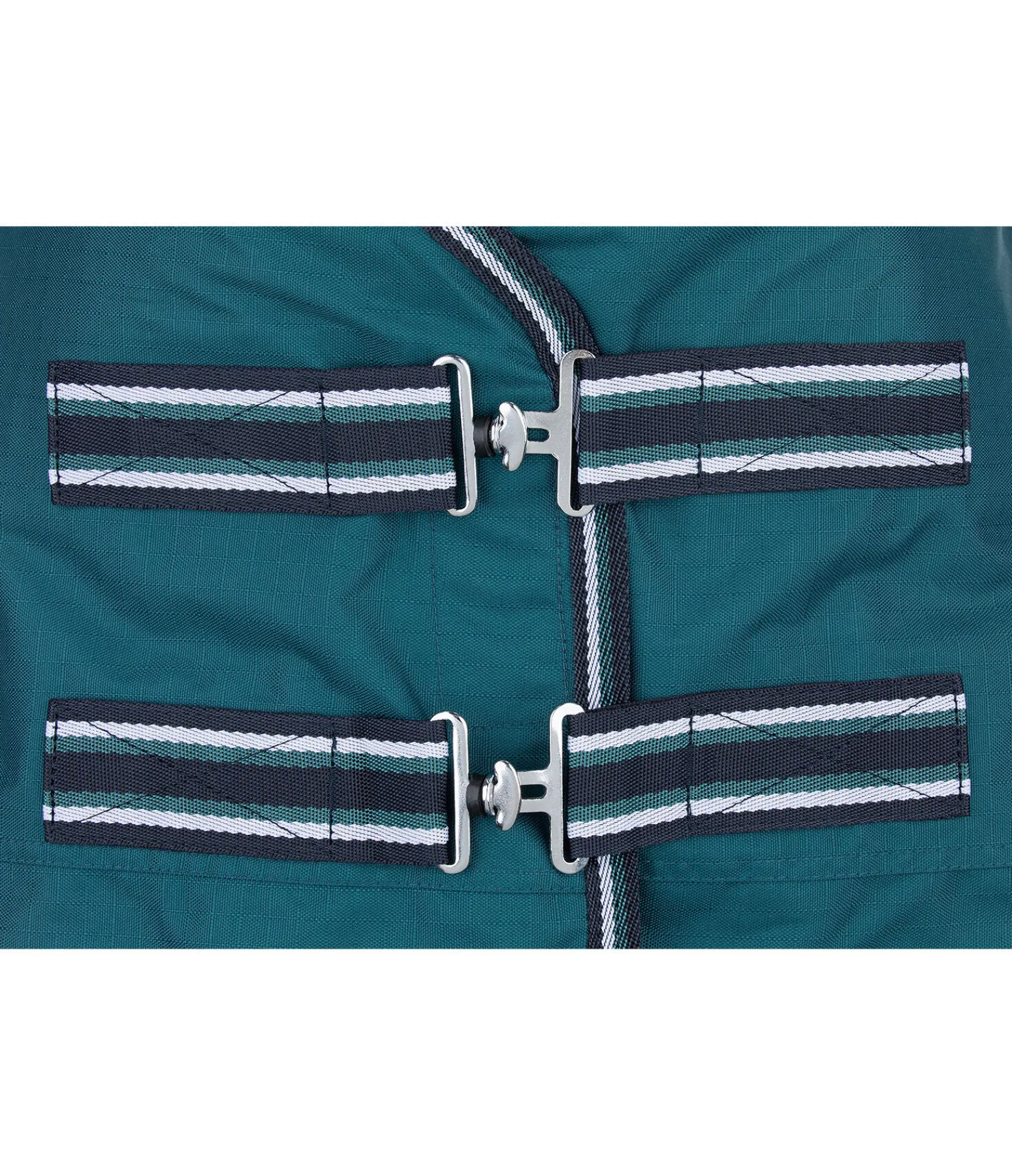 Couverture d’extérieur classique. Imperméable (3.000 mm). En matière Ripstop résistante (600 deniers) avec garnissage 50 g léger. Avec plis d’aisance pour une liberté de mouvement optimale, double fermeture de poitrail avec crochets en T et patte auto-agrippante supplémentaire, sursangles croisées réglables et rabat de queue. Anneaux permettant la fixation de courroies de cuisses (non incluses), courroie de queue réglable incluse. Pad de garrot permettant d’éviter les pressions et irritations dues aux frottements. Doublure lisse protégeant la robe. 100 % polyester.