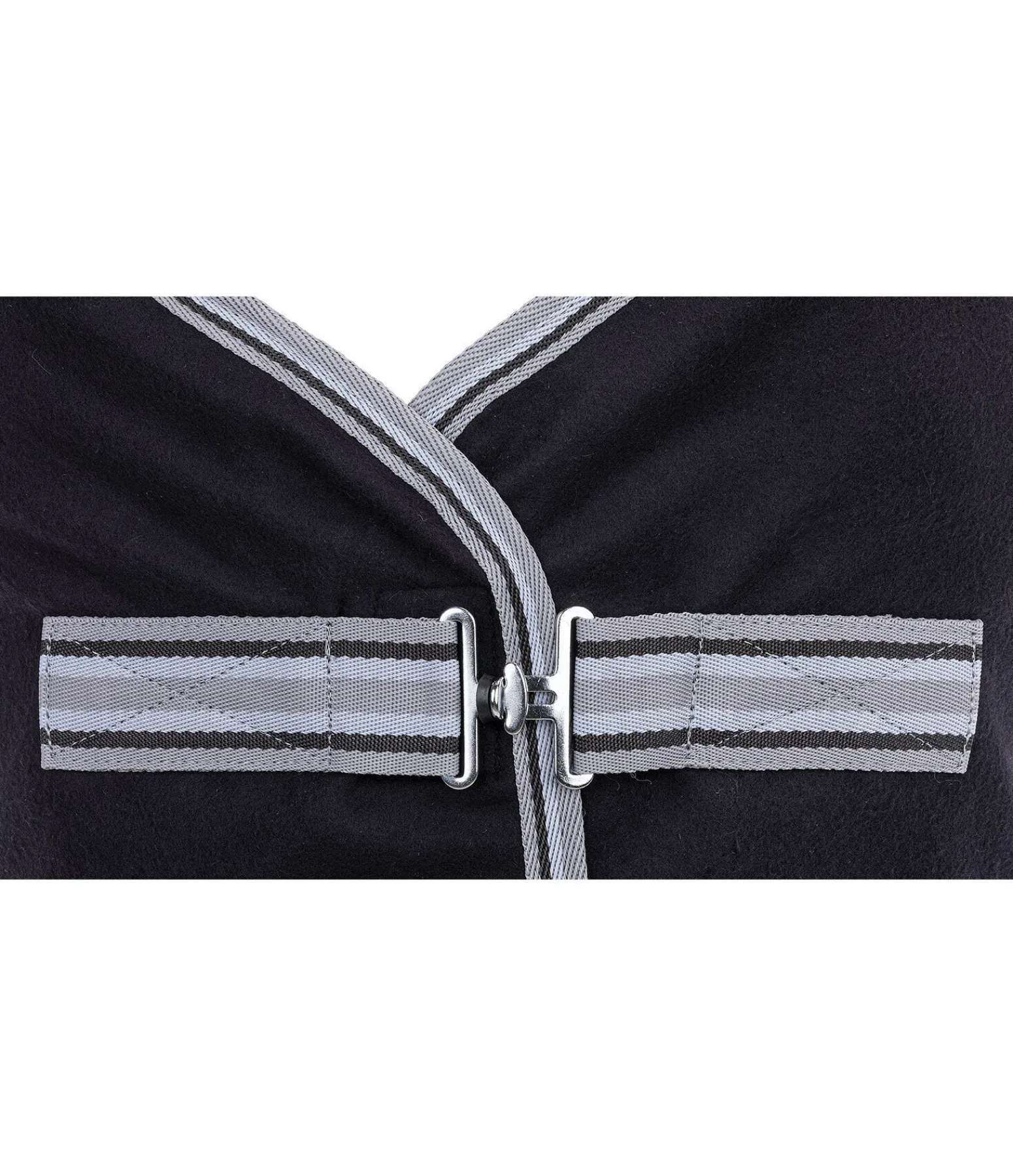 Couverture séchante en polaire, simple et élégante. Fermeture de poitrail avec crochet en T. Pad de garrot en polaire douce et doublure lisse satinée au niveau des épaules pour éviter la casse des crins et les irritations dues aux frottements. 100 % polyester.