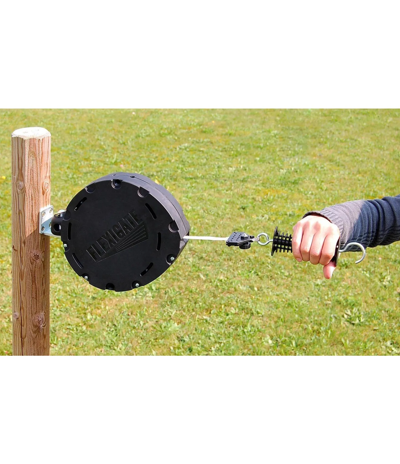 Idéal pour séparer de petits paddocks dans les prés ou à l’écurie. Déroulable jusqu’à 19,5 m, largeur du ruban 20 mm. Évite les rubans qui pendouillent, les risques de trébucher, les risques de pincement des crins ou les rubans salis. Poignée de clôture, support de fixation et vis à bois inclus.