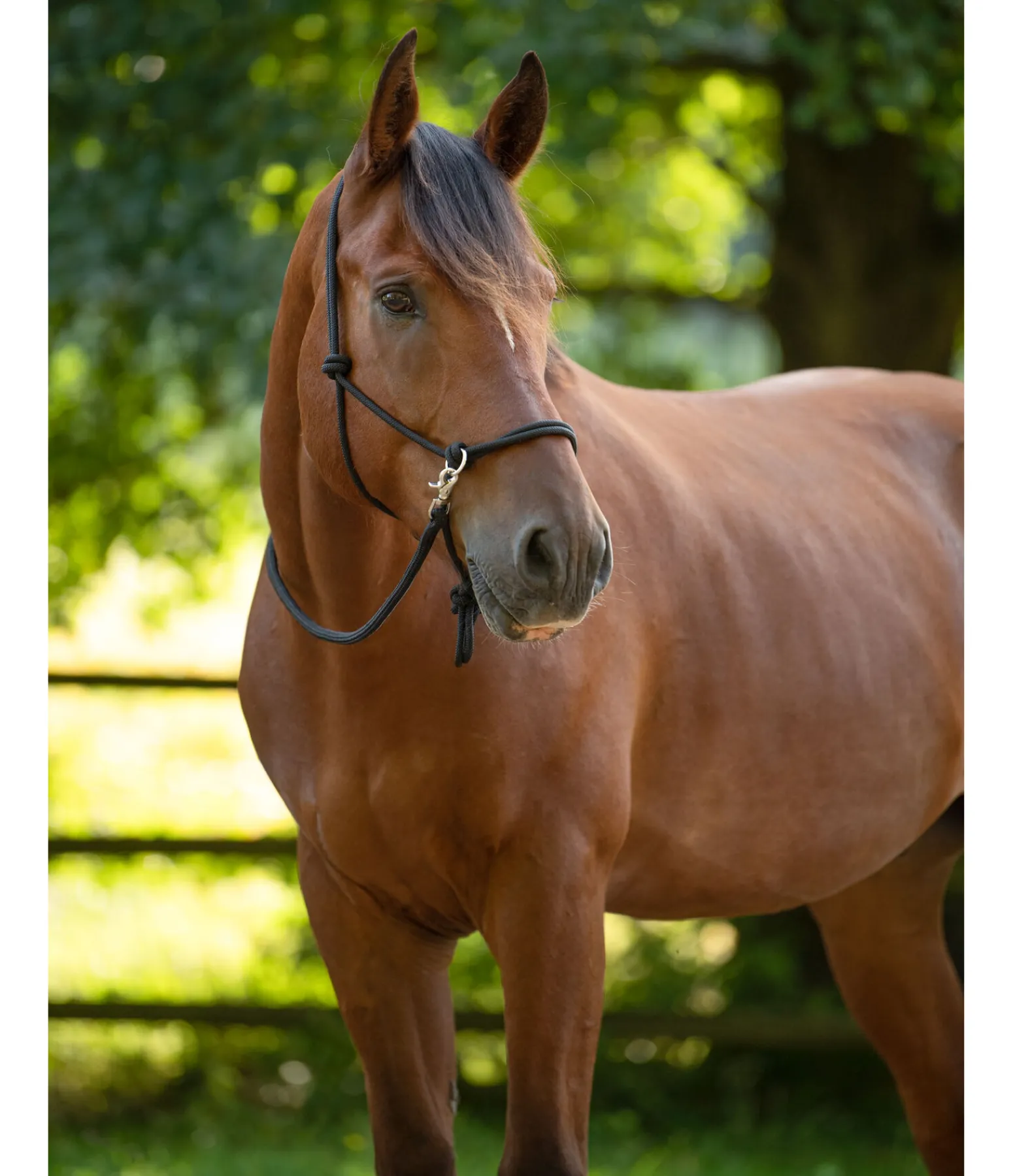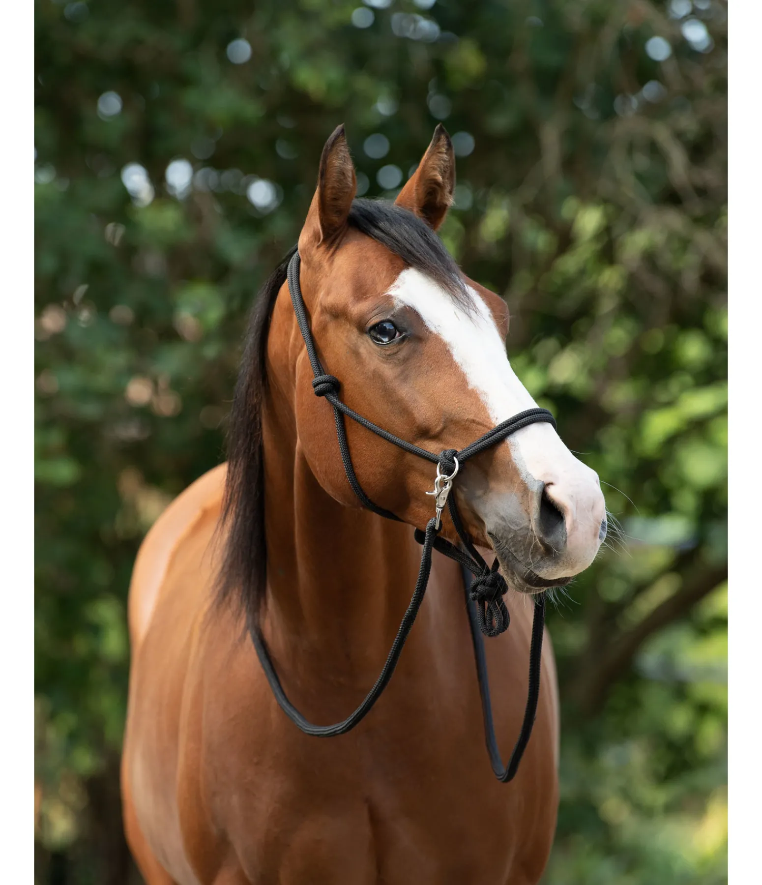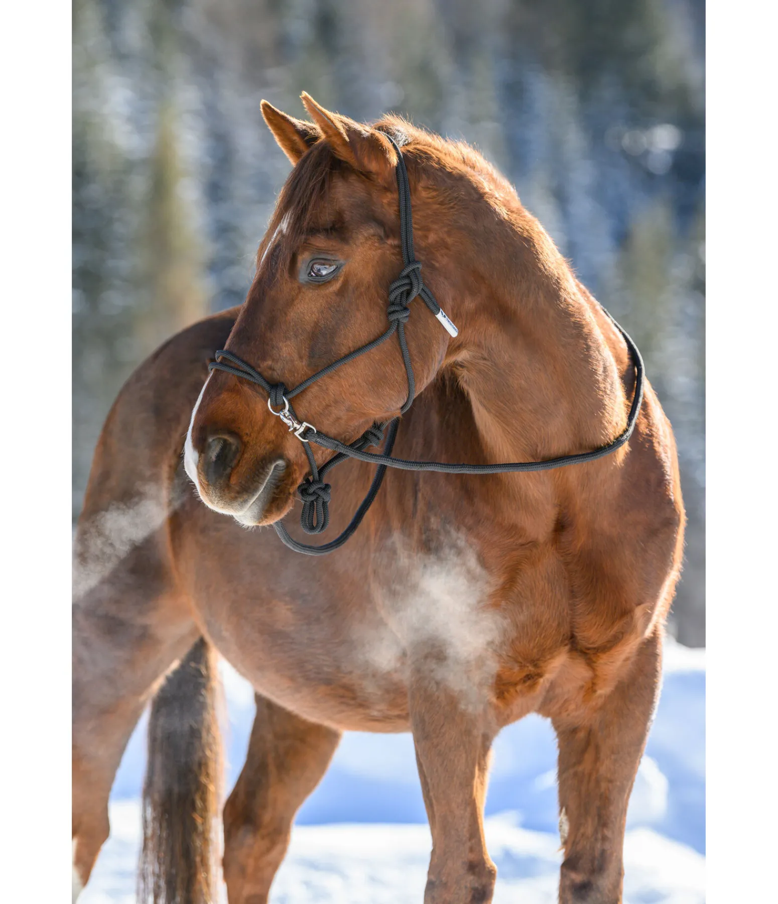 Licol à noeuds avec anneaux et rênes fermées à mousquetons. Longueur des rênes 2,6 m.