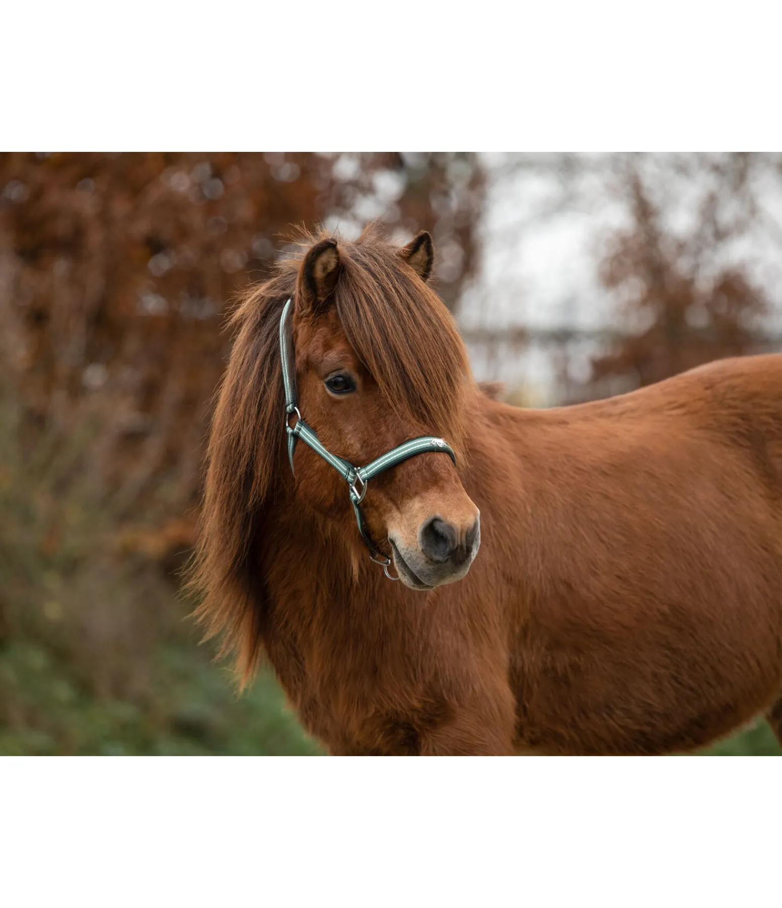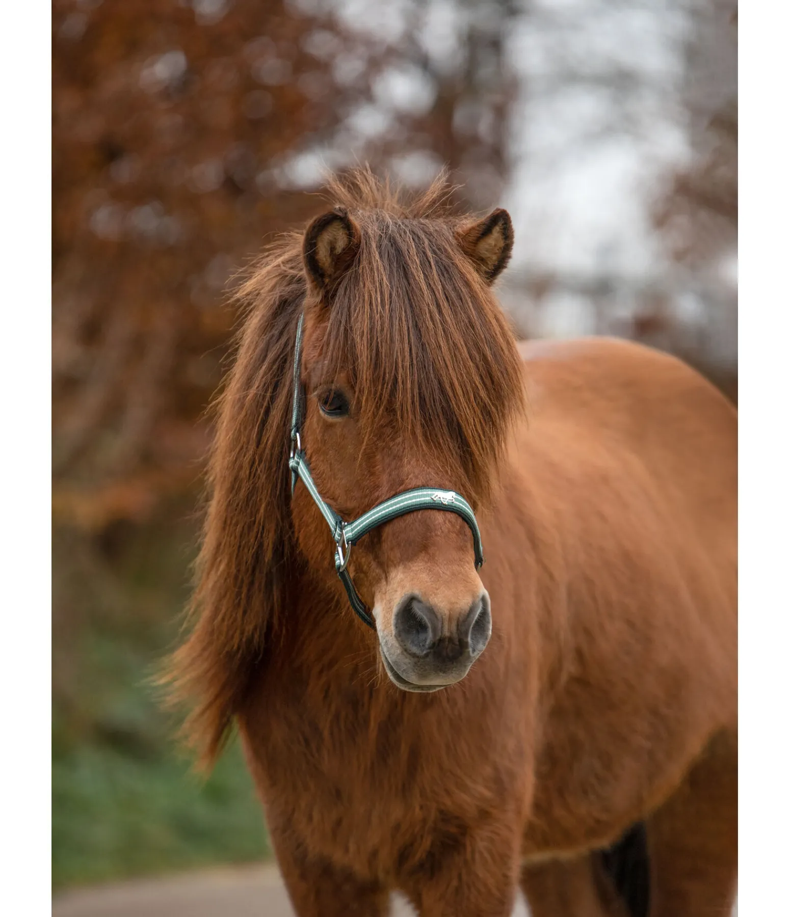 Licol au look sportif. Médaillon argenté en forme de cheval islandais sur la muserolle. Doublure moelleuse. Têtière et muserolle réglables.