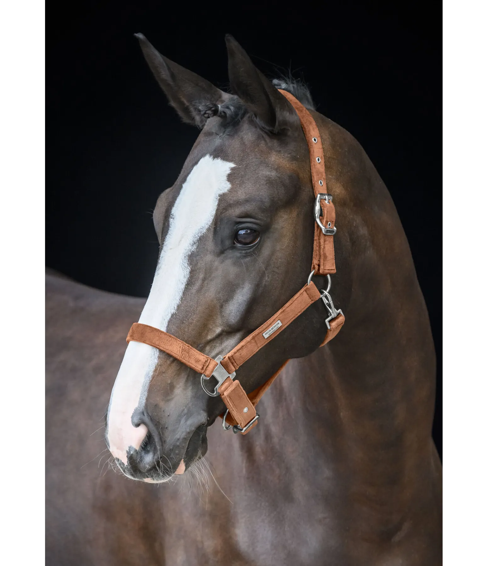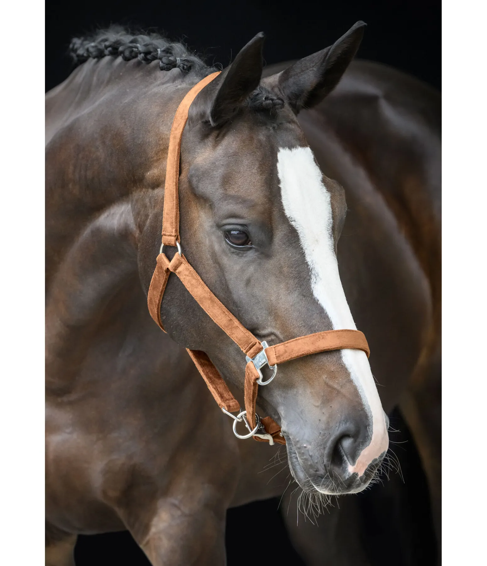 Élégant licol entièrement doublé en matière satinée. Avec plaque logo métallique brillante. Têtière et muserolle réglables. 100 % polypropylène.