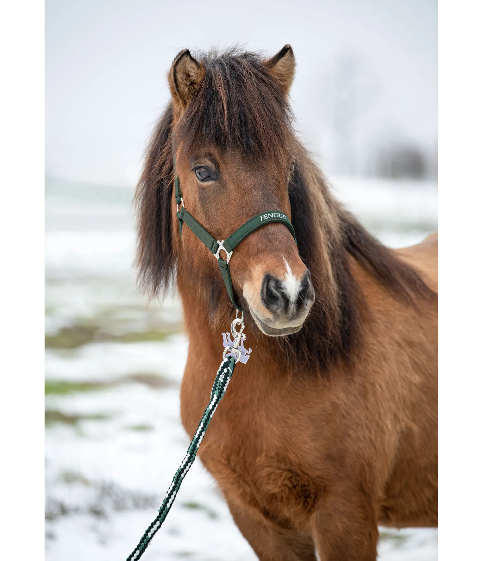 Longe longue avec mousqueton tressée de plusieurs couleurs. Médaillon en caoutchouc avec logo. Bouclerie argentée. 100 % polyester.