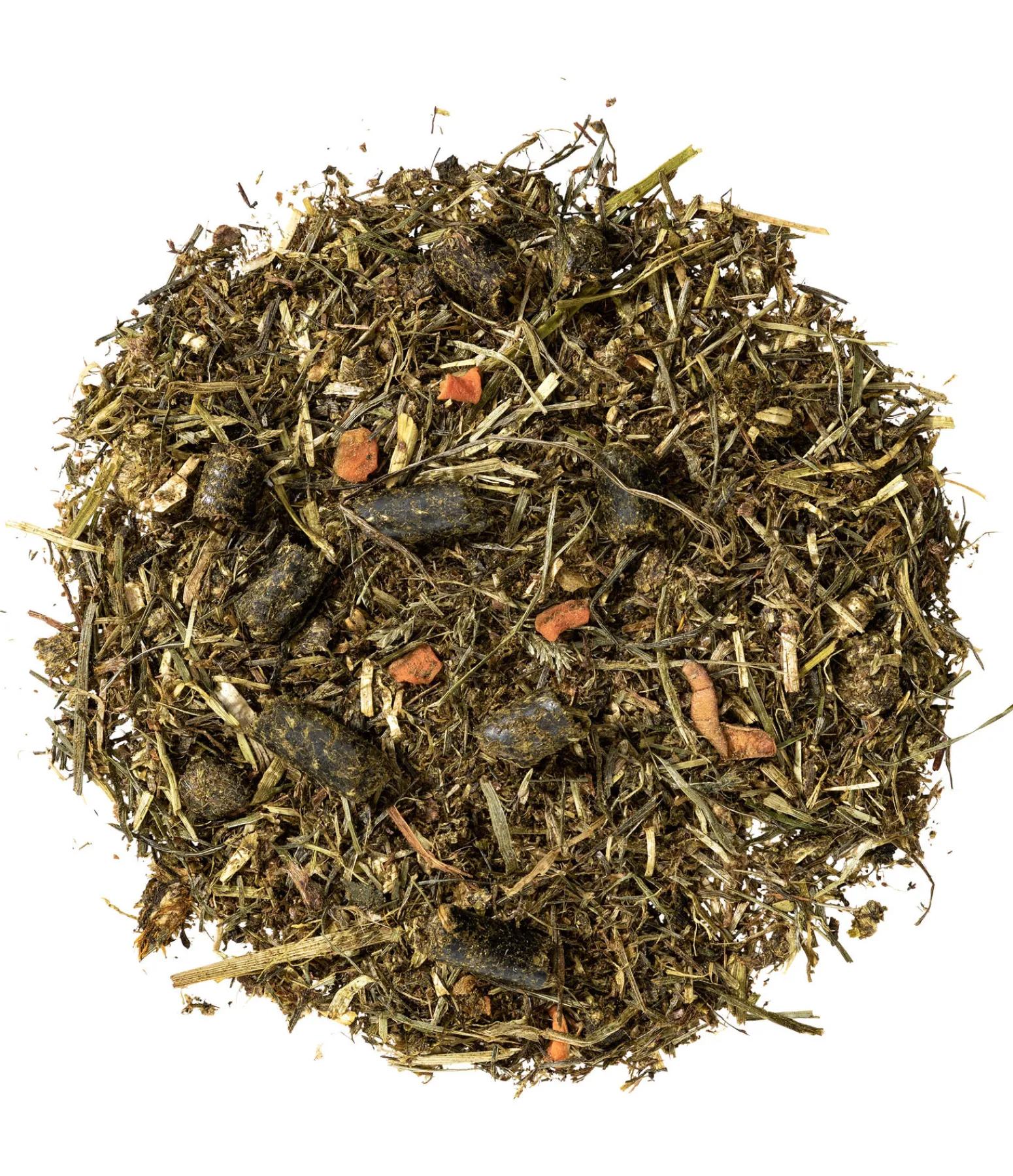 Composition : fibres de prairie, herbes de prairie, tourteau de lin, huile de lin, chips de carotte, vinaigre de pomme, betterave rouge, psyllium, mélange d’herbes.