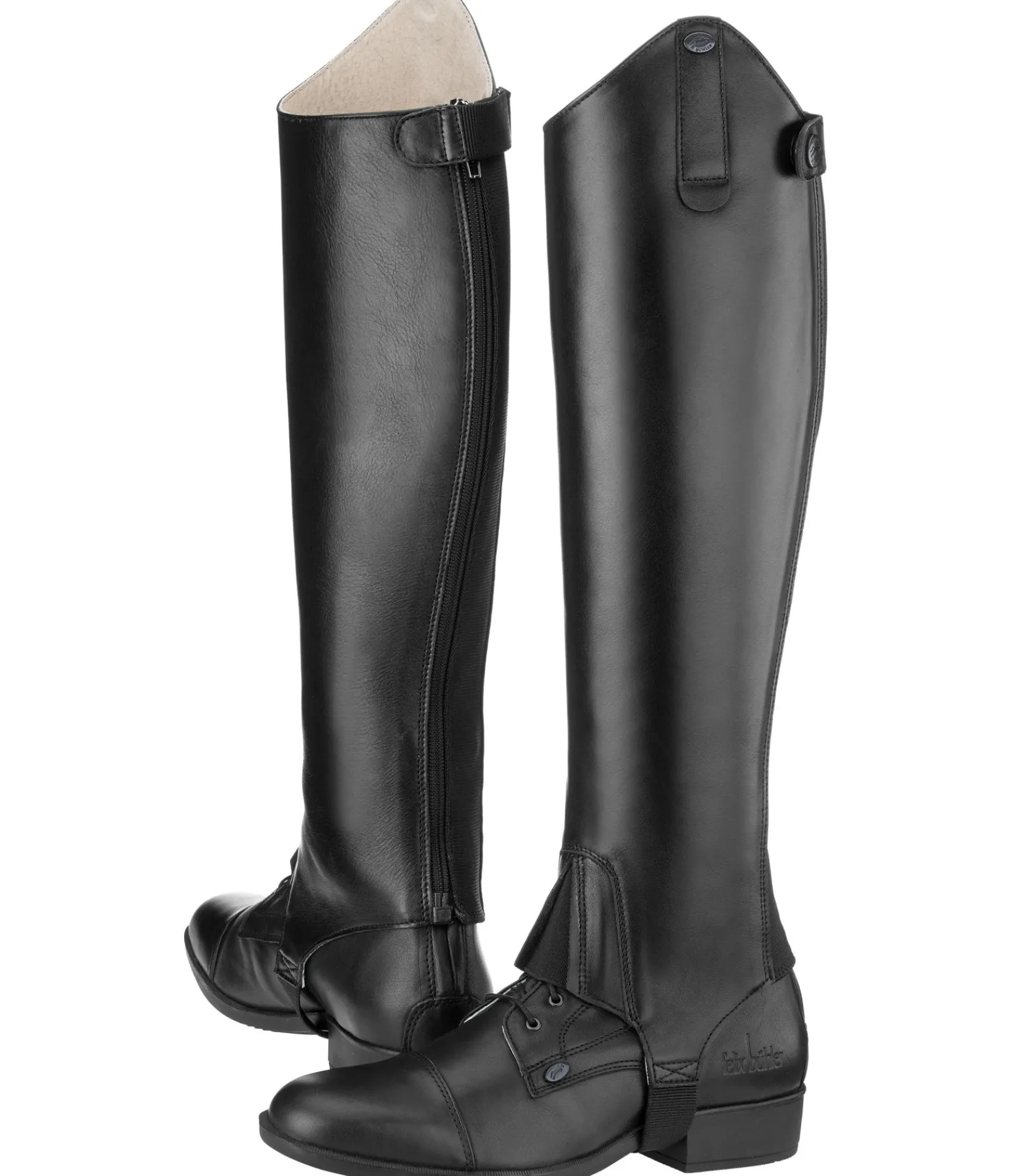 Mini-chaps de grande qualité en cuir de vachette italien pleine fleur souple et résistant. Doublure en cuir de porc doux. Empiècement élastiqué le long de la fermeture à glissière à l’arrière pour un ajustement parfait. Empiècement élastiqué supplémentaire sur le devant pour une bonne adaptation à la bottine. Belles finitions, solide fermeture à glissière de la marque OPTI et sous-pieds robustes. Fabriquées au Portugal.