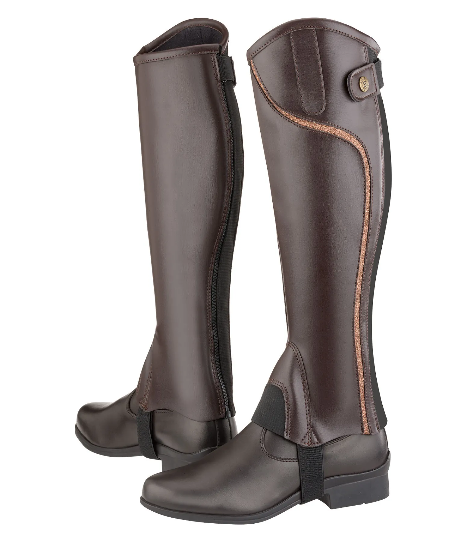 Ces mini-chaps à l’aspect de bottes d’équitation attirent tous les regards grâce à leur ruban scintillant intégré. Leurs points forts sont notamment la coupe parfaite et l’aspect élégant du synthétique. Les empiècements élastiqués le long de la fermeture à glissière YKK robuste à l’arrière assurent un ajustement parfait au mollet.