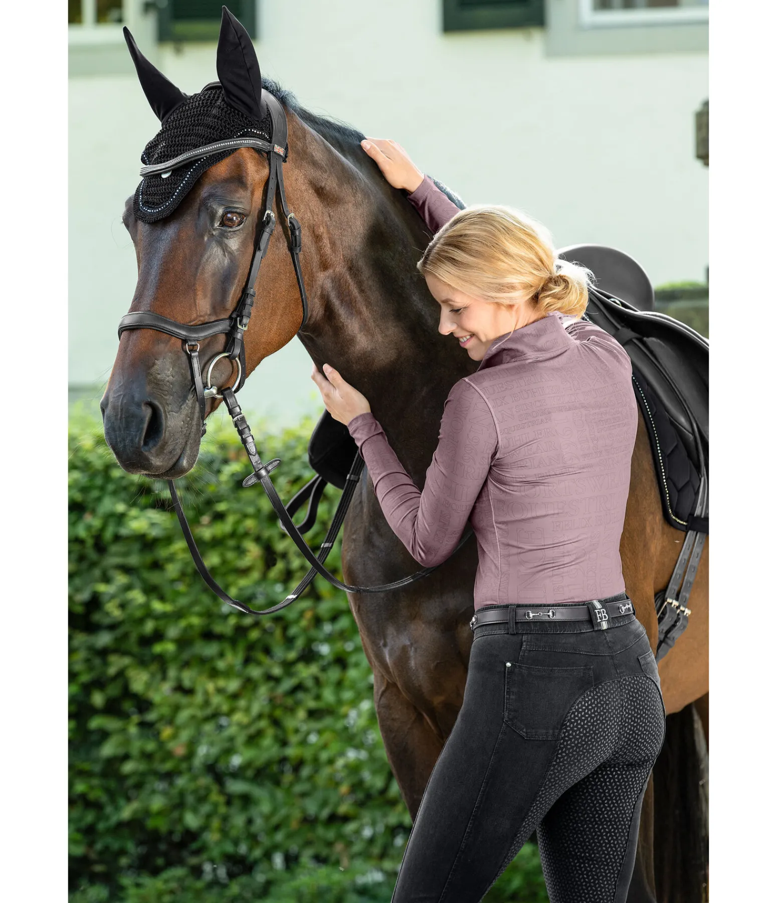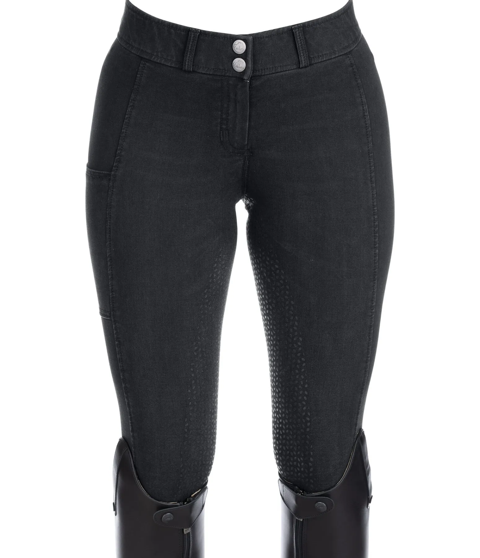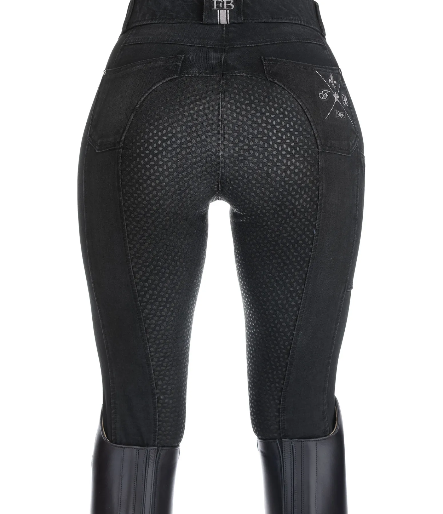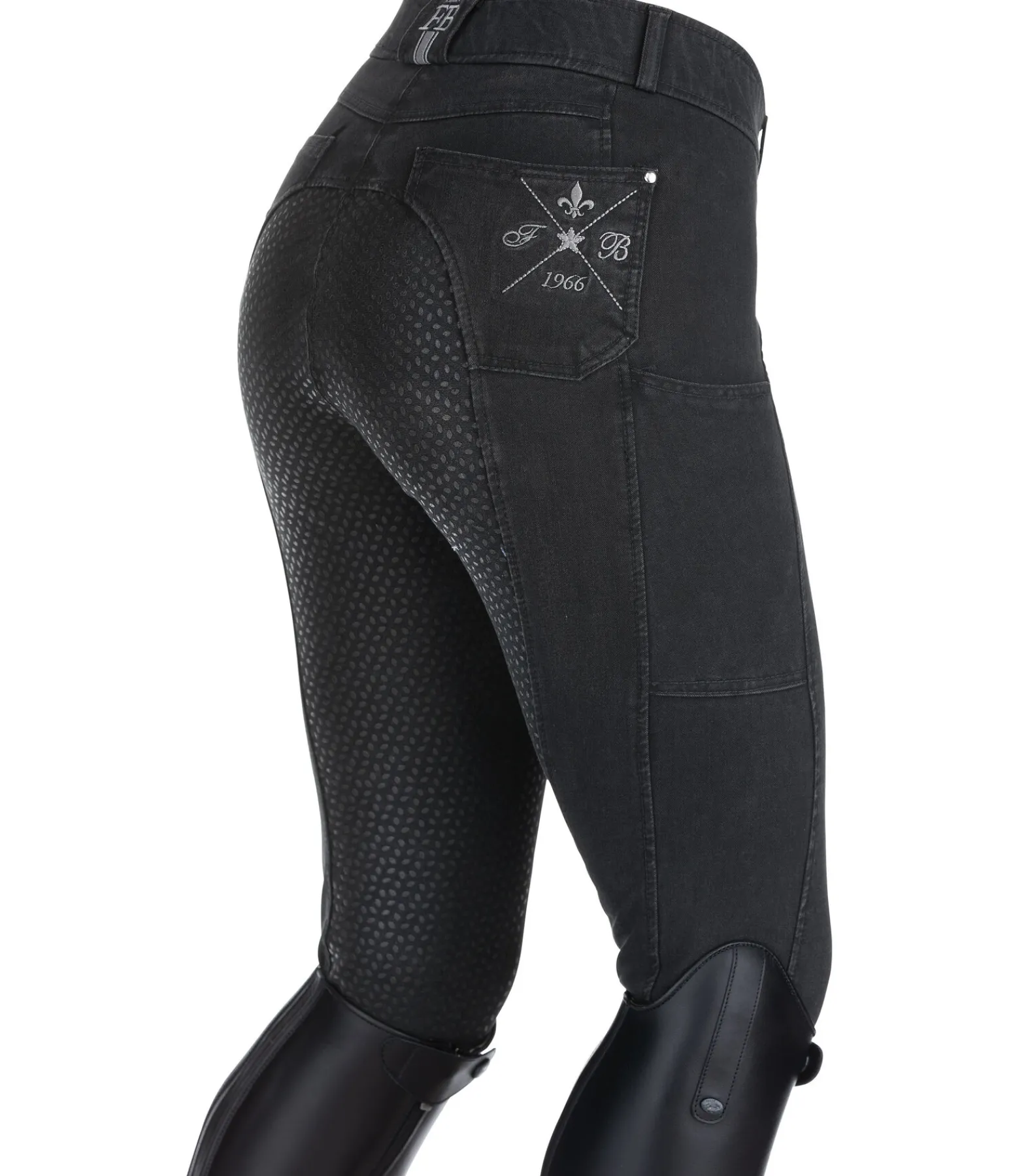 Pantalon d’équitation en denim doux. Fond intégral en silicone. Effet vintage. Ceinture large élastiquée avec deux boutons. Poche sur la cuisse pour téléphone portable et 2 poches arrière. Broderie Felix Bühler à l’arrière. Aucune couture au niveau des genoux. Bas de jambe extensible en matière stretch. 60 % coton, 24 % polyester, 10 % viscose, 6 % élasthanne.