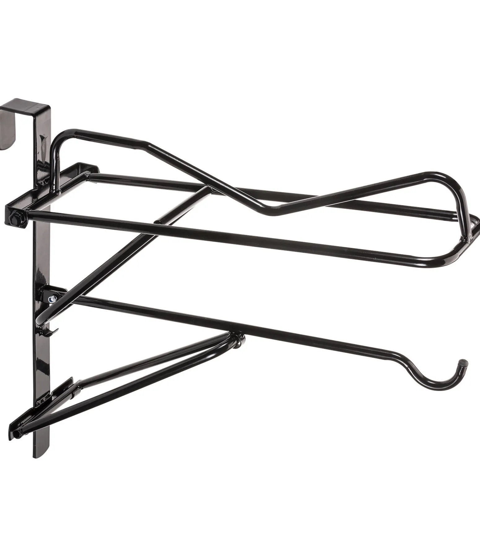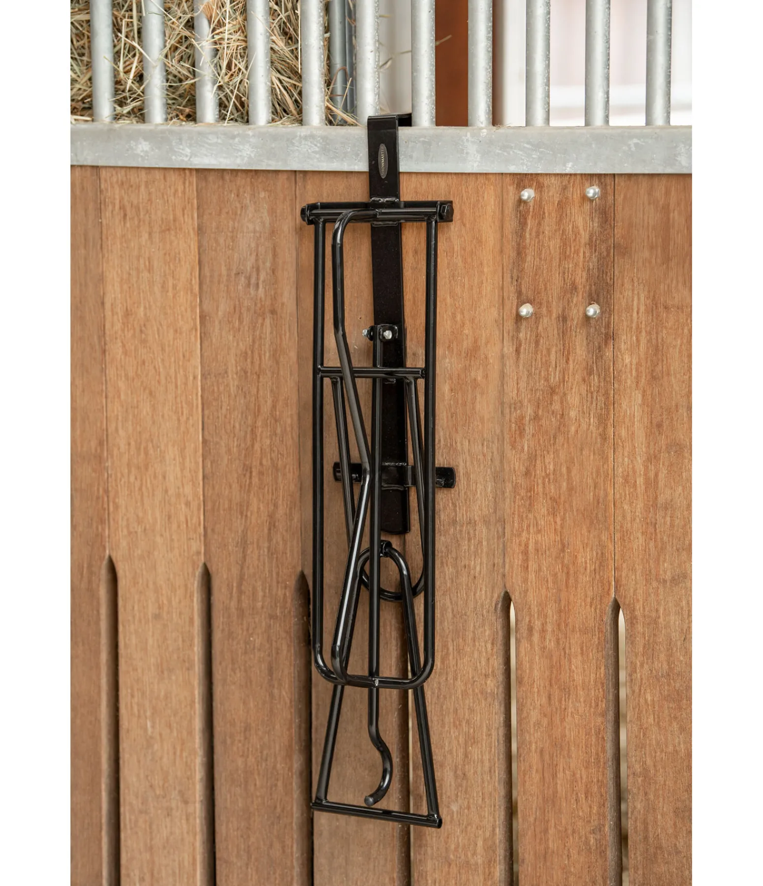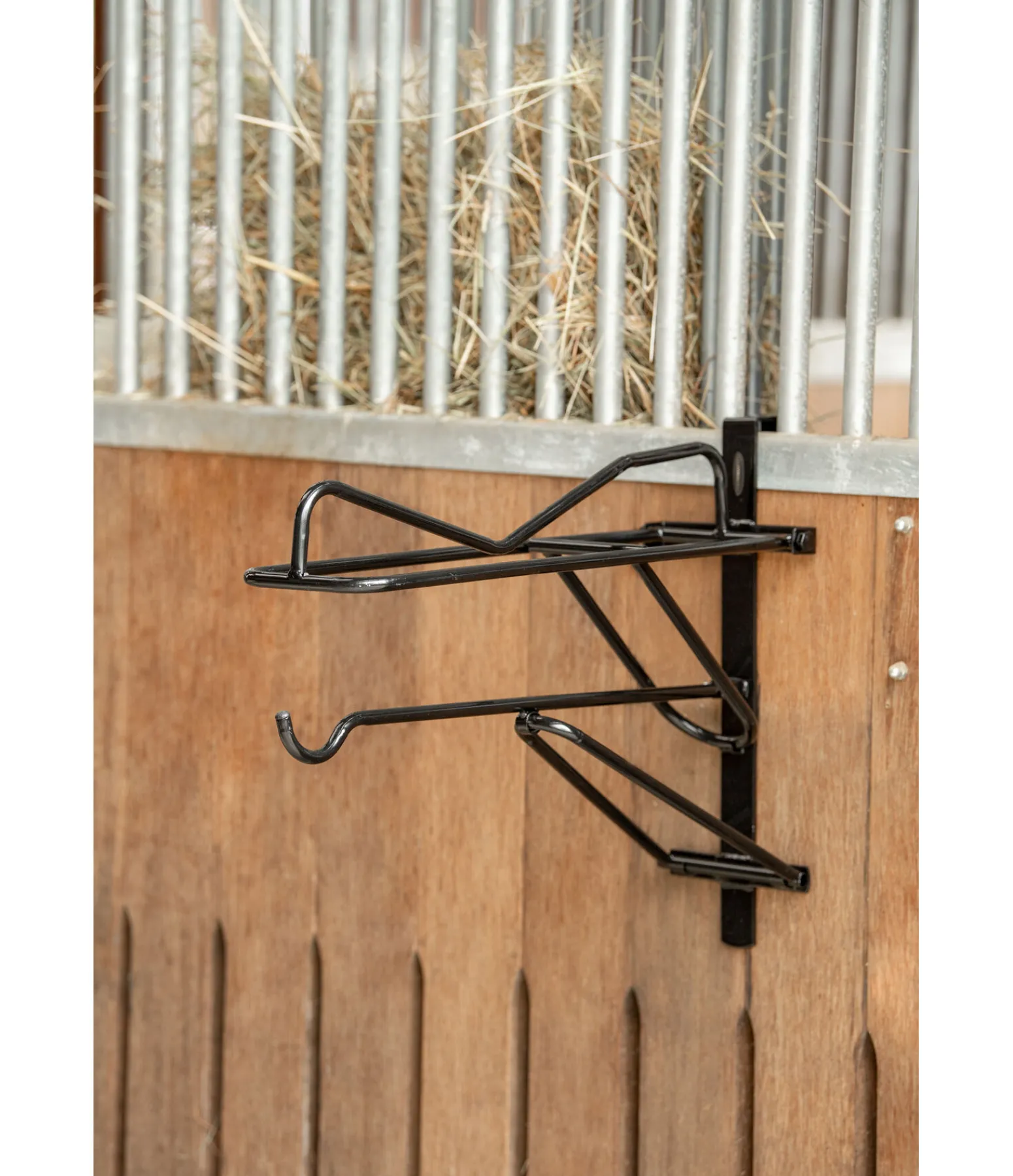 Porte-selle tout-en-un à suspendre grâce à son crochet. Peut ainsi être accroché à la porte du box, par exemple. Sous le porte-selle se trouve une barre avec un crochet arrondi à son extrémité. Ainsi, le tapis ou l’amortisseur et le bridon ou le licol trouvent également leur place. Le porte-selle se replie facilement lorsqu’il n’est pas utilisé.