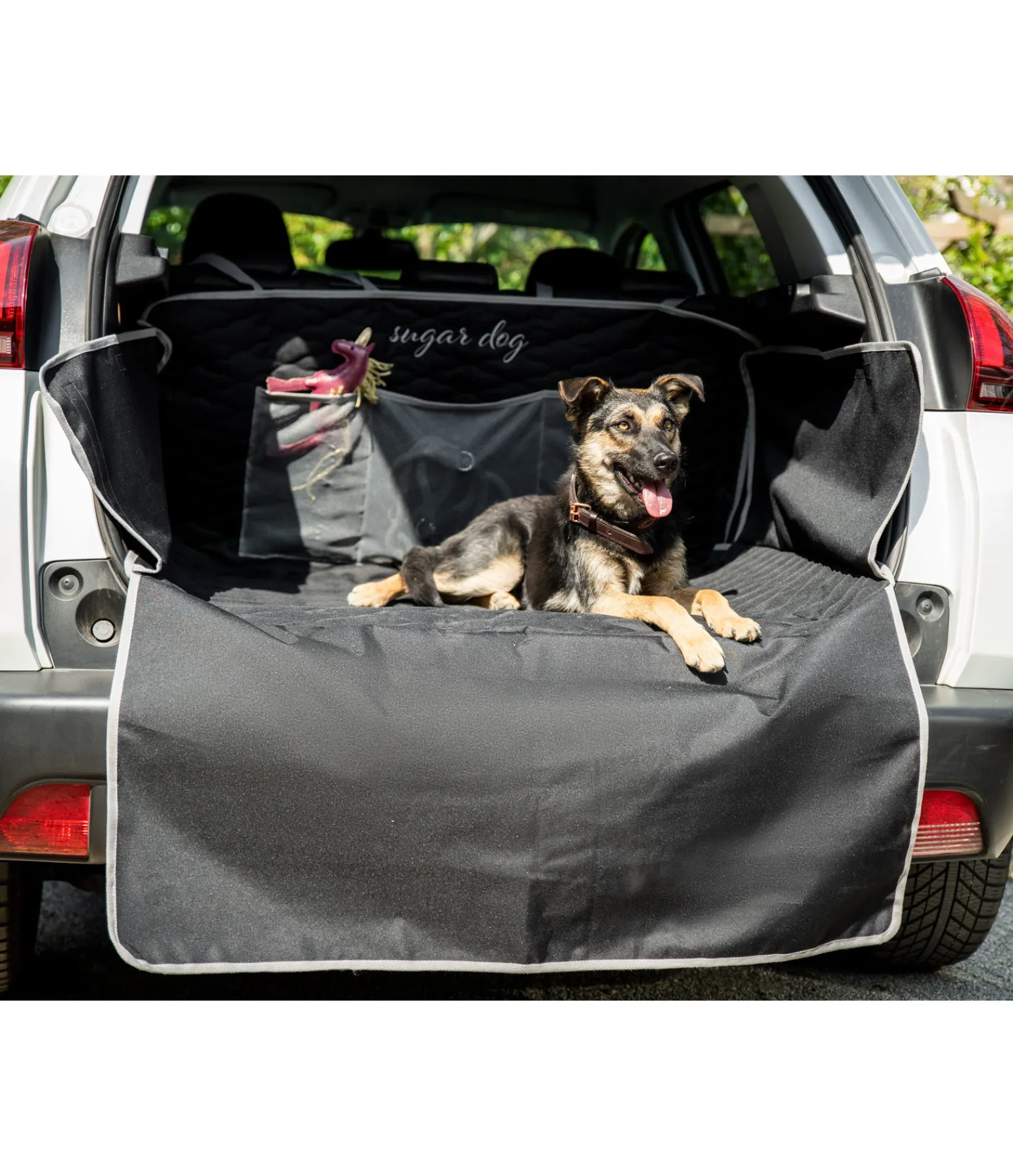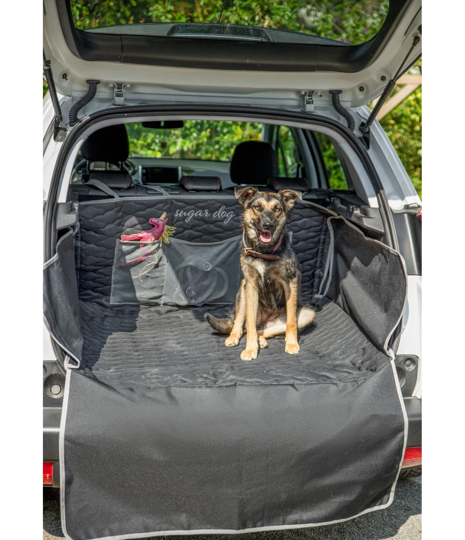 Protection déperlante, résistante et anti-salissures pour coffre de voiture. Le rembourrage fin en polyester Oxford en fait un couchage confortable pour le chien. Bandes auto-agrippantes sur les côtés et sangles de fixation aux appuie-têtes de la banquette arrière sur le fond. Avec tapis dépliable pour éviter les rayures sur le pare-chocs. Espaces de rangement en filet. 171 x 185 cm (protection pare-chocs incluse). 100 % polyester.