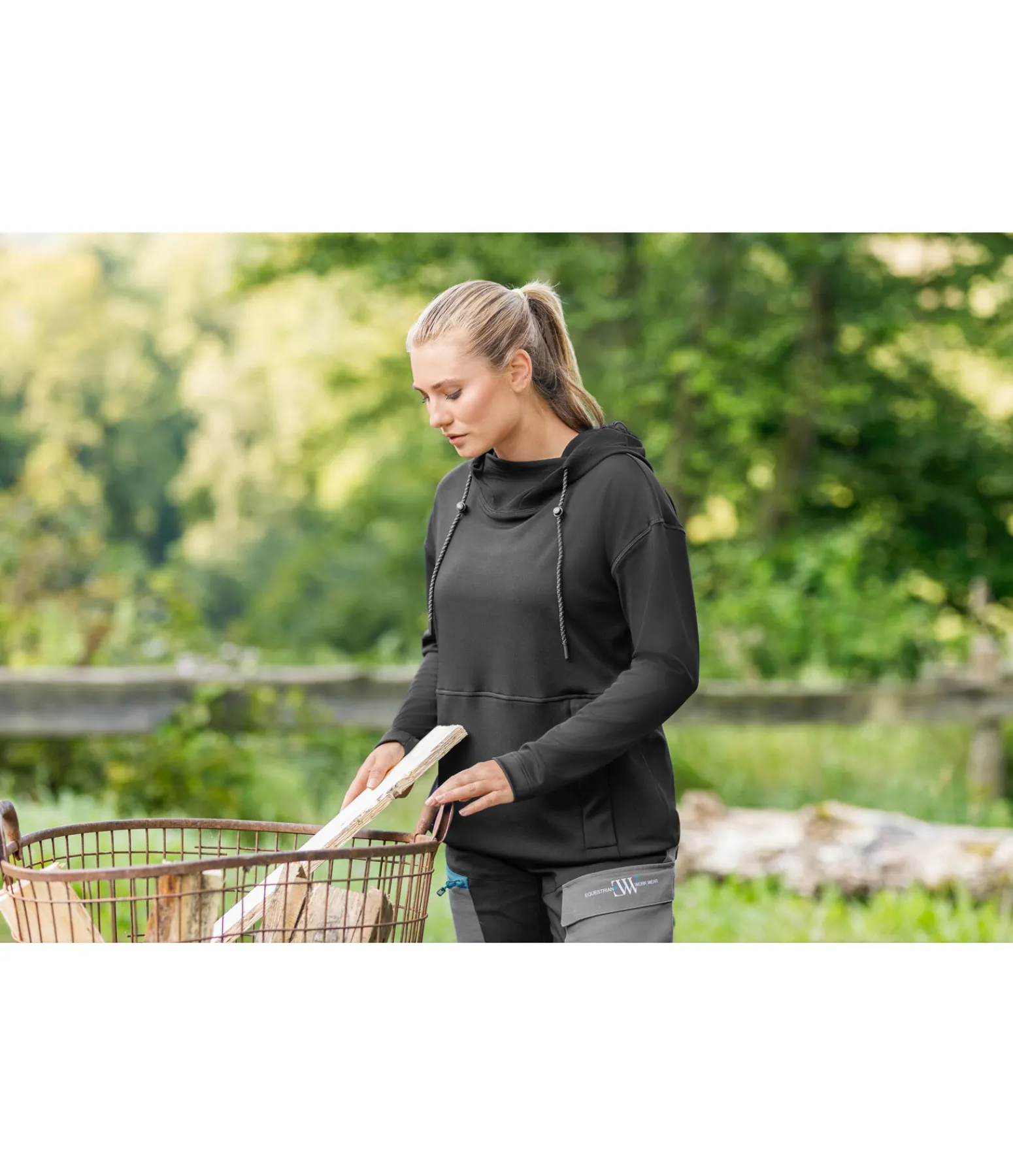 Sweat à capuche décontracté en coupe oversize tendance avec grand imprimé dans le dos. La matière technique lisse à l’extérieur et molletonnée à l’intérieur est respirante, à séchage rapide et anti-saletés. Idéal pour les travaux à l’écurie ! 2 larges poches zippées, un col protégeant du vent, une taille réglable et une capuche complètent cet article indispensable pour toute amatrice de plein air !