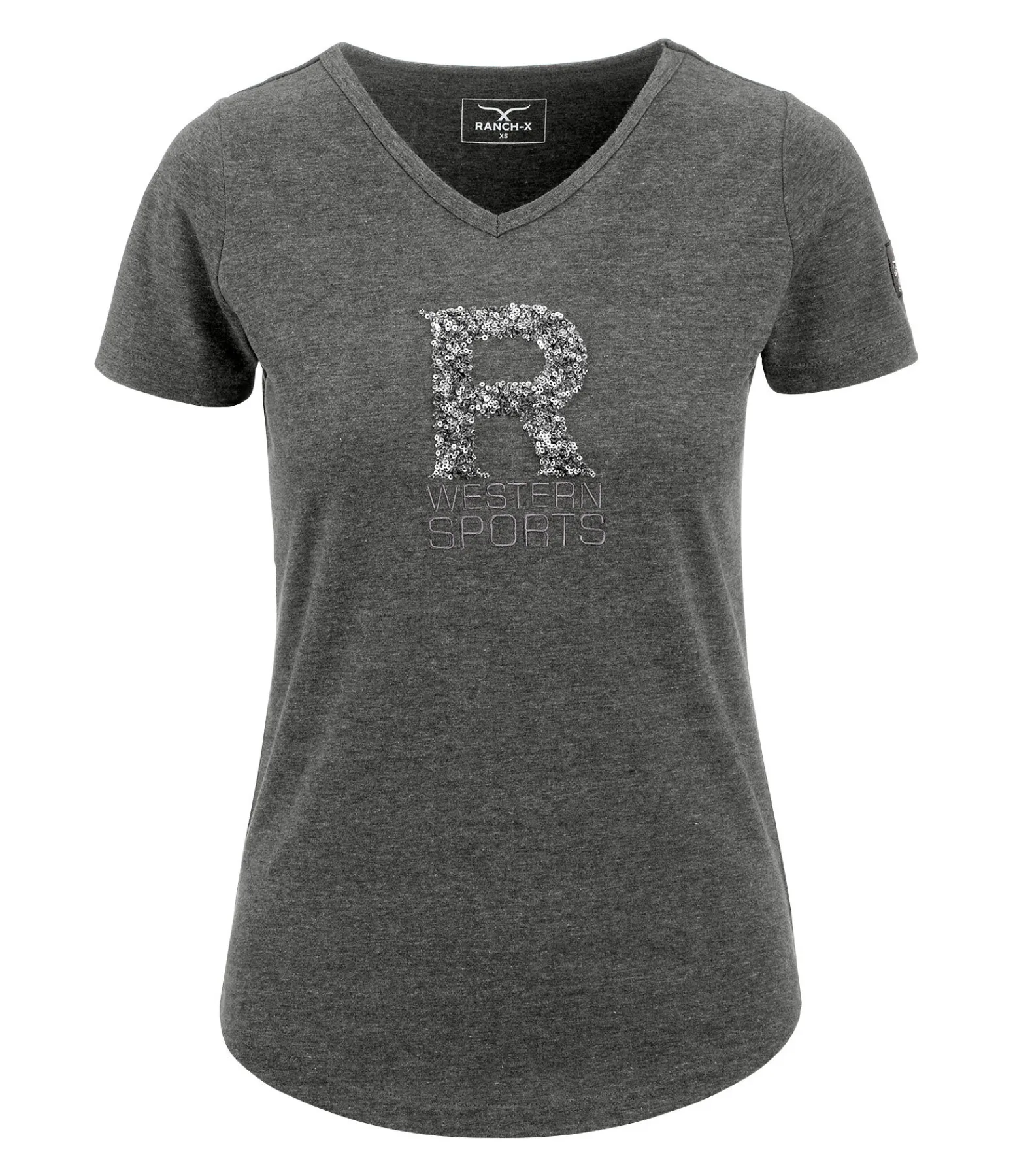 T-shirt col-V. Coupe ample et matière respirante. Motif à paillettes. 65 % polyester, 35 % coton.