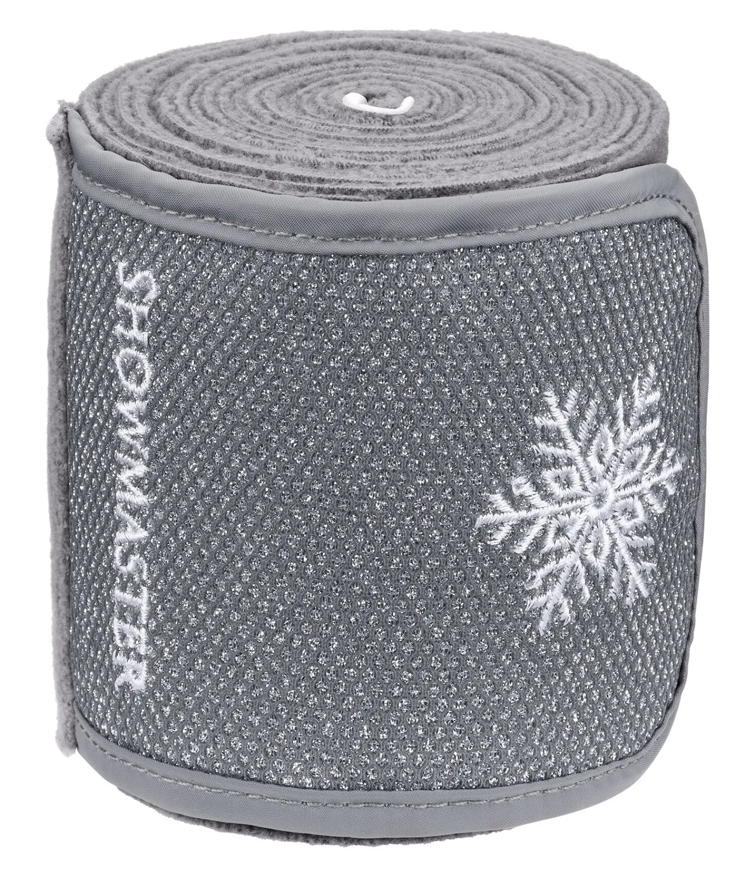 Bandes de Noël en polaire. Large patte auto-agrippante recouverte d’un tissu scintillant et d’une broderie flocon de neige. 350 x 11 cm. 100 % polyester.