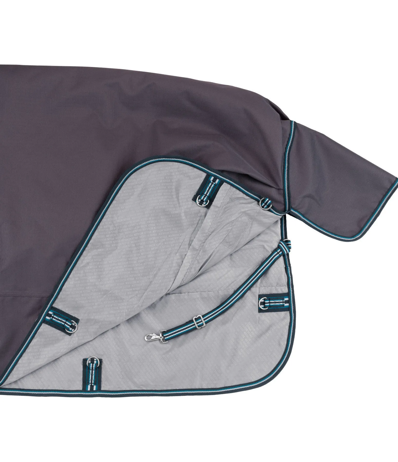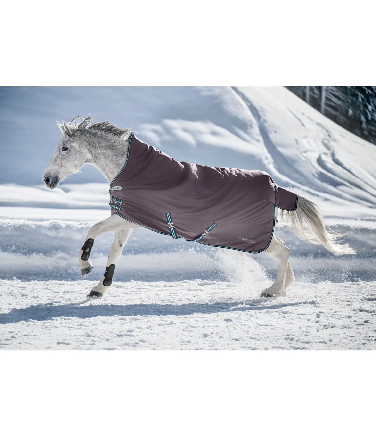 Couverture d’extérieur 4 en 1 avec système de liners innovant, dans une coupe Highneck ! Une couverture – une multitude de possibilités : couverture d’extérieur en matière imperméable (5.000 mm) et particulièrement robuste 1.200 deniers. Livrée avec 2 liners matelassés de 100 g (vert) et 200 g (bleu). La partie imperméable comprend une longue fermeture à glissière dissimulée le long des flancs, qui permet de fixer les différents liners à la couverture avec des pattes auto-agrippantes supplémentaires. Les deux liners peuvent être combinés pour les jours les plus froids afin de former une couverture 300 g. Cette couverture peut ainsi être utilisée en tant que simple chemise imperméable 0 g ou en tant que couverture avec garnissage 100 g, 200 g ou 300 g. Ce système innovant permet d’ajouter des épaisseurs sans embarrasser le cheval avec des fermetures, sursangles ou boucles supplémentaires. Grâce à ce système, cette couverture est également plus pratique et moins encombrante que les couvertures avec liners classiques. La partie extérieure est équipée d’une fermeture de poitrail équilibrée en plusieurs points réglable des deux côtés, avec mousquetons, anneaux et patte auto-agrippante supplémentaire. Rembourrage au niveau de l’encolure pour un confort optimal. Doublure lisse protégeant la robe pour éviter les irritations dues aux frottements. Sursangles croisées réglables, rabat de queue et courroie de queue. Anneaux permettant de fixer des courroies de cuisses (non incluses). 100 % polyester. En raison de ses propriétés innovantes, ce produit est protégé par un modéle d’utilité.