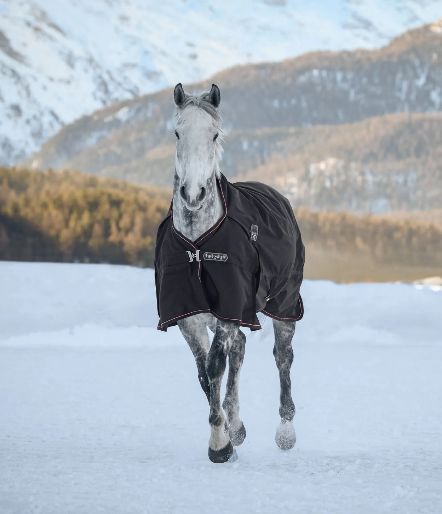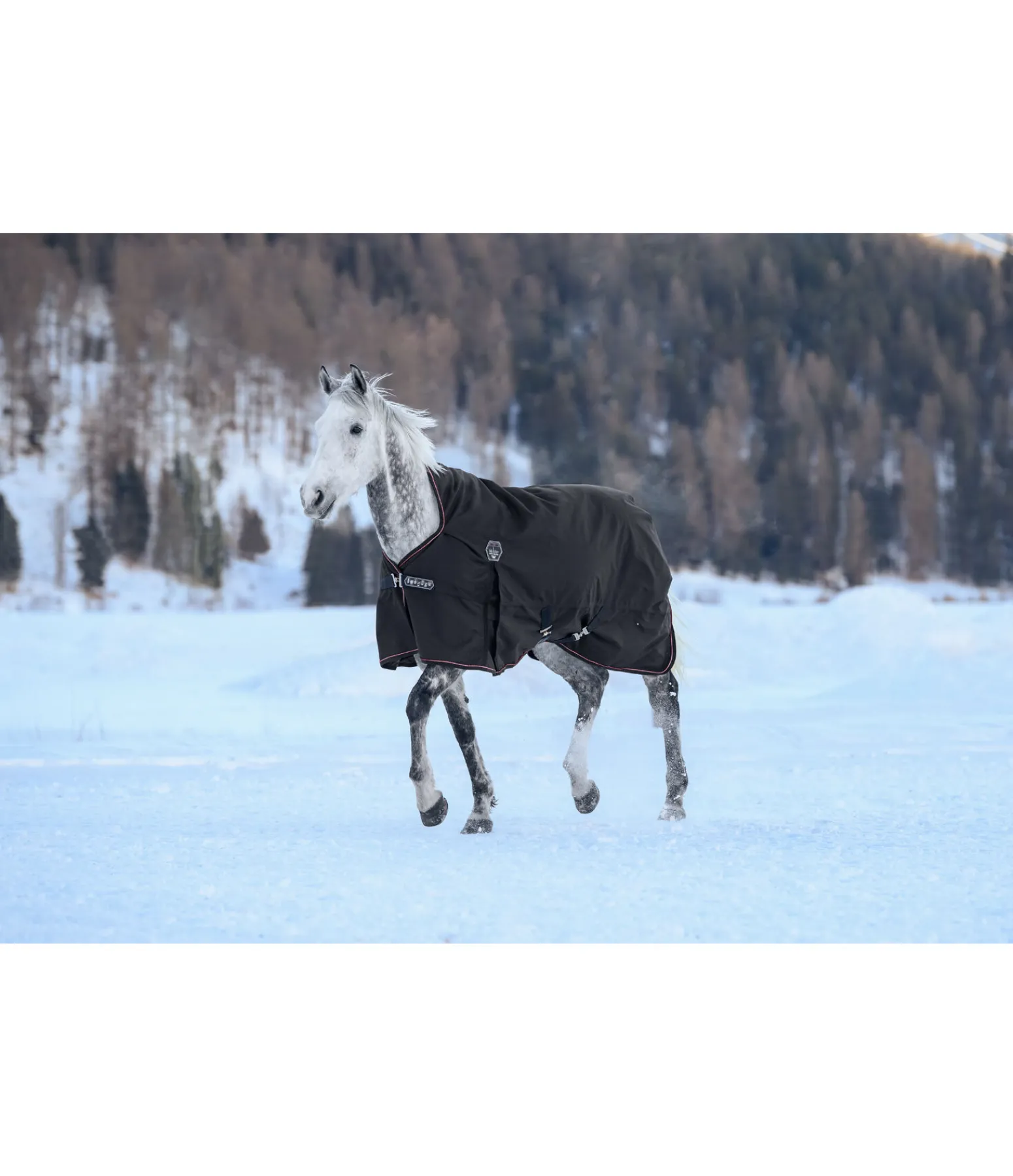 Couverture d’extérieur Highneck confortable, particulièrement imperméable et respirante (5 000 mm). Matière résistante 1 200 deniers, dotée d’un garnissage chaud 200 g pour une circulation de l’air et une protection optimale contre le froid. Hauts plis d’aisance aux épaules pour une grande liberté de mouvement et une protection complète contre les intempéries. Rembourrage confortable au garrot réduisant les points de pression. Doublure intérieure lisse aux épaules pour protéger la robe. Équipée d’une fermeture de poitrail simple à crochets en T. Sursangles croisées et courroie de queue réglable en longueur. En option : extension de poitrail associée : 422 647. 100 % polyester.