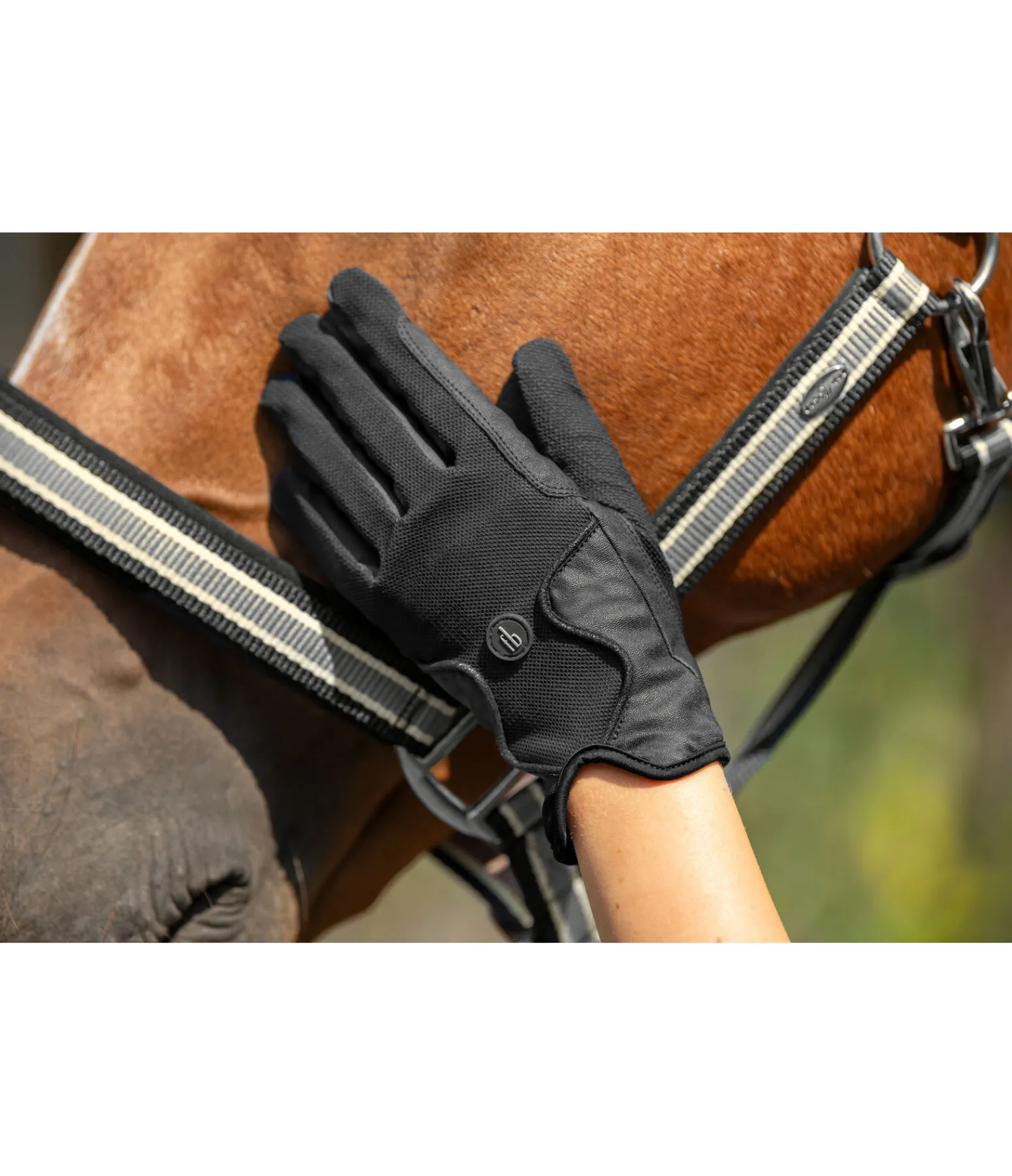 Gants d’équitation d’été élégants et respirants avec dos de la main en matière mesh sublimé de lignes scintillantes. Enfilage facile car sans fermeture. Renfort à l’index. Compatibles avec les écrans tactiles. Dos et paume de main 40 % polyuréthane, 60 % polyester, mesh 100 % nylon.