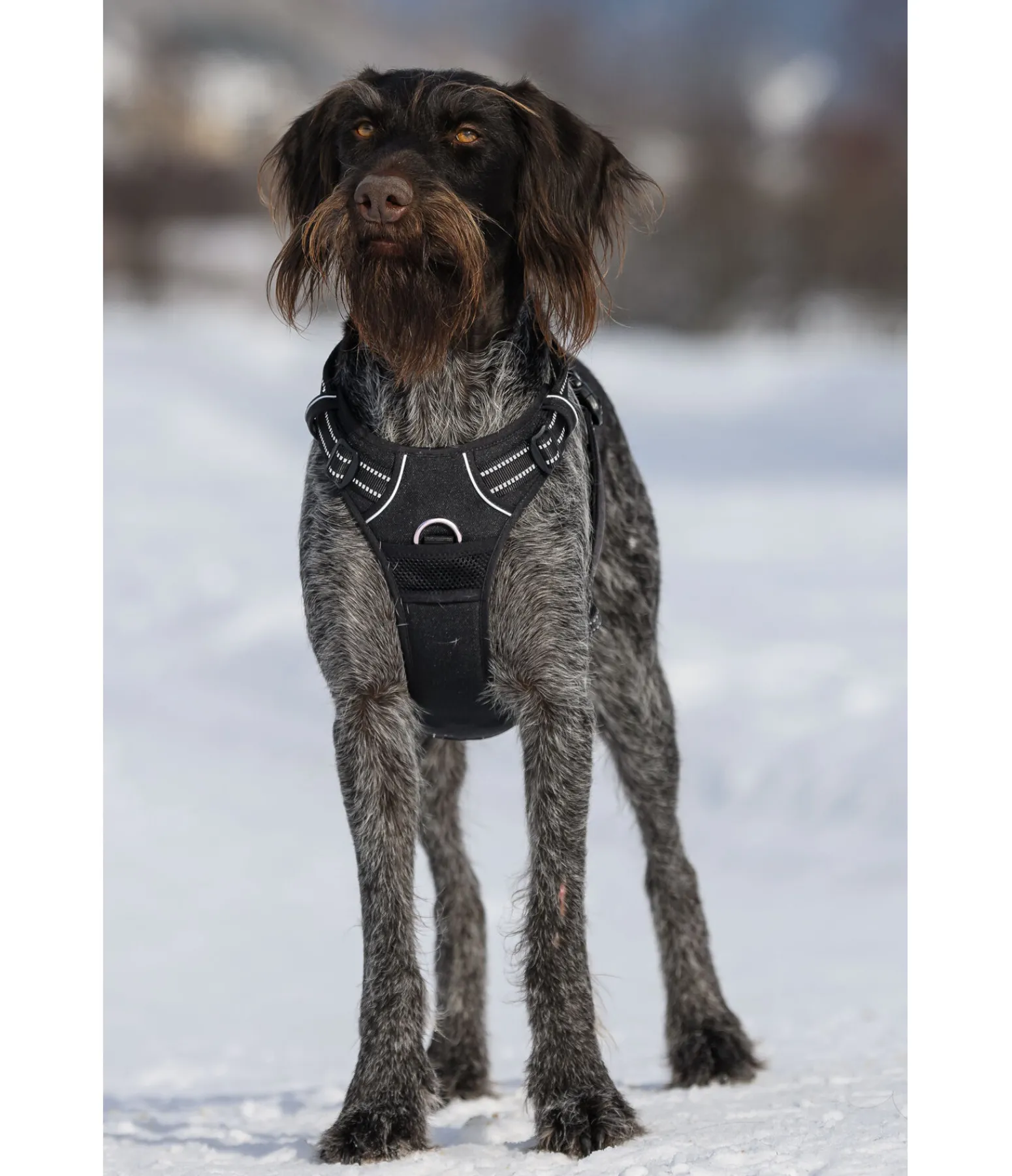Harnais ultra robuste. Idéal pour le quotidien ou pour partir en expédition. Les solides sangles en nylon comportent de nombreux éléments réfléchissants pour plus de sécurité dans l’obscurité. Le rembourrage intérieur en mesh respirant assure un confort optimal. La sangle en nylon sur le poitrail et sur le dos est réglable sur chaque côté pour que le harnais s’adapte parfaitement à la morphologie du chien ! Les deux fermetures à clip robustes Duraflex® peuvent supporter jusqu’à 50 kg, selon la taille du harnais choisie. La boucle en aluminium sur la sangle avant droite permet d’ouvrir le harnais sur un côté pour un enfilage facile. Petite poignée sur la sangle dorsale pour garder le chien au pied. Boucle pour fixer un pendentif LED (réf. 600 010) ou un médaillon. La laisse peut être fixée à l’anneau en D sur le dos ou à l’anneau classique sur le poitrail. L’anneau classique est protégé par un filet extensible, utile pour les entraînements lorsque le chien tire en laisse. Harnais 100 % polyester, lanières 100 % nylon.