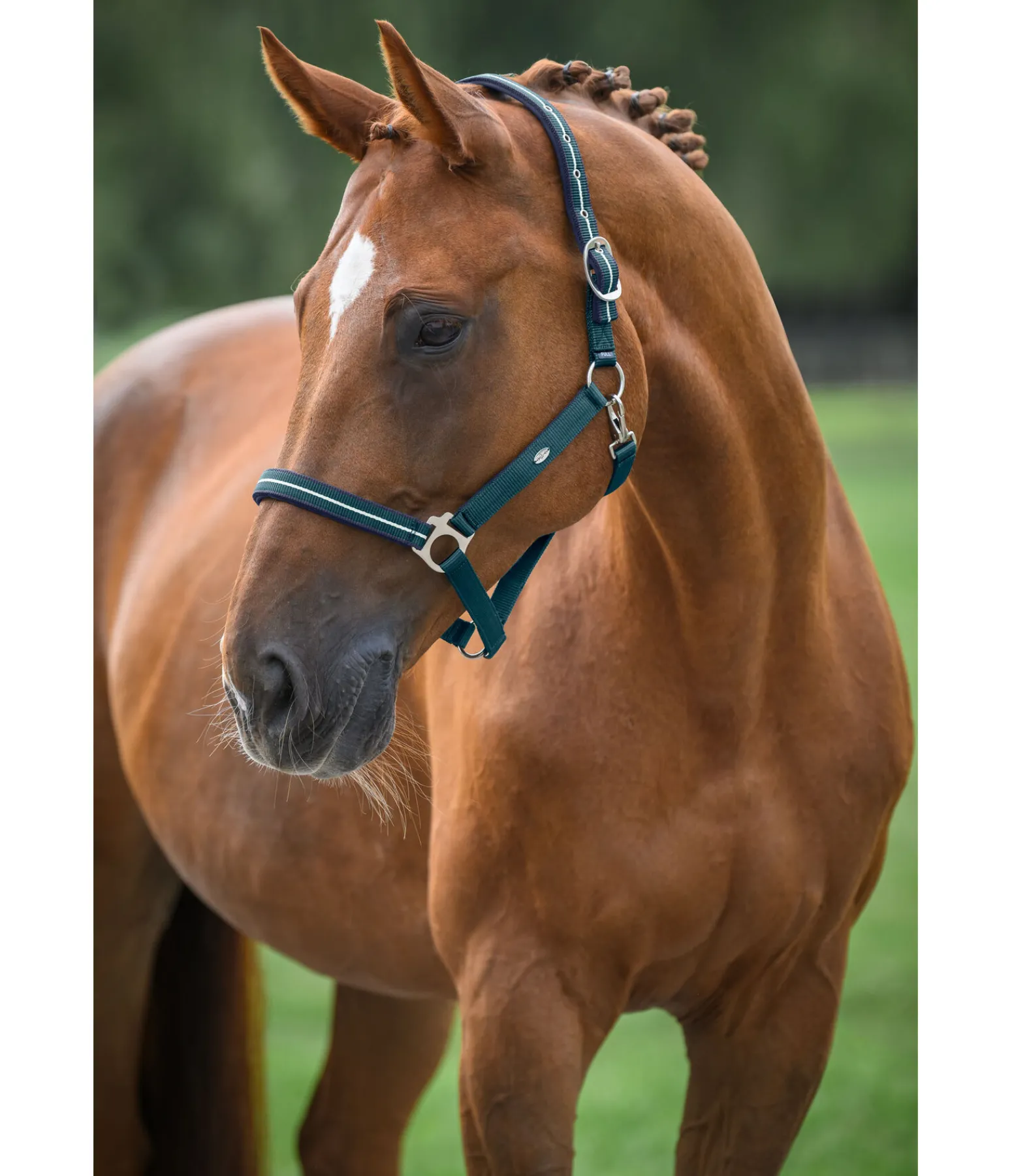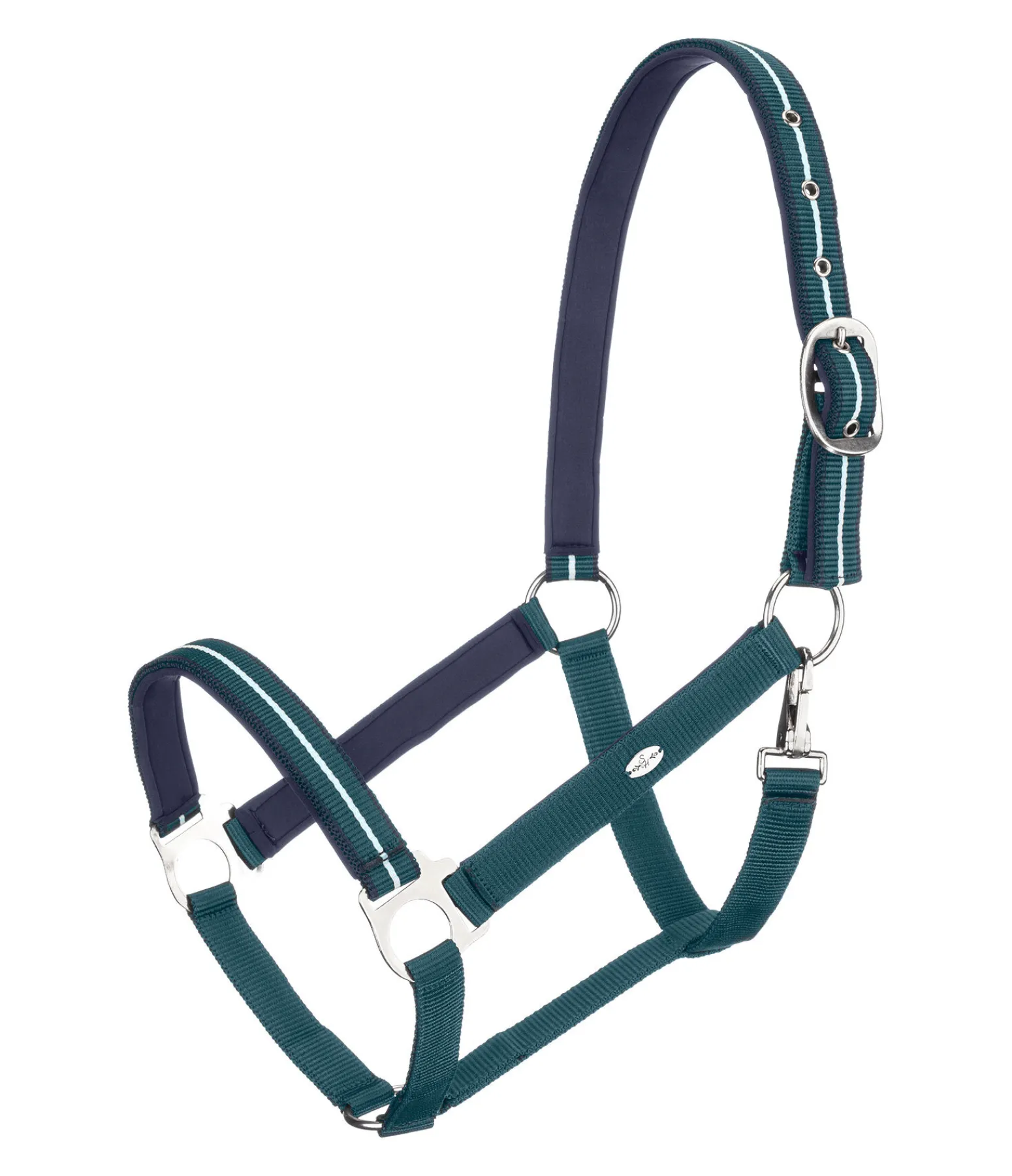 Licol avec rayure discrète. Doublure douce en caoutchouc chloroprène à la têtière, à la muserolle et aux montants pour un confort optimal. Plaque métallique argentée filigrane avec gravure logo sur les deux montants. Têtière facilement réglable. 100 % polypropylène.