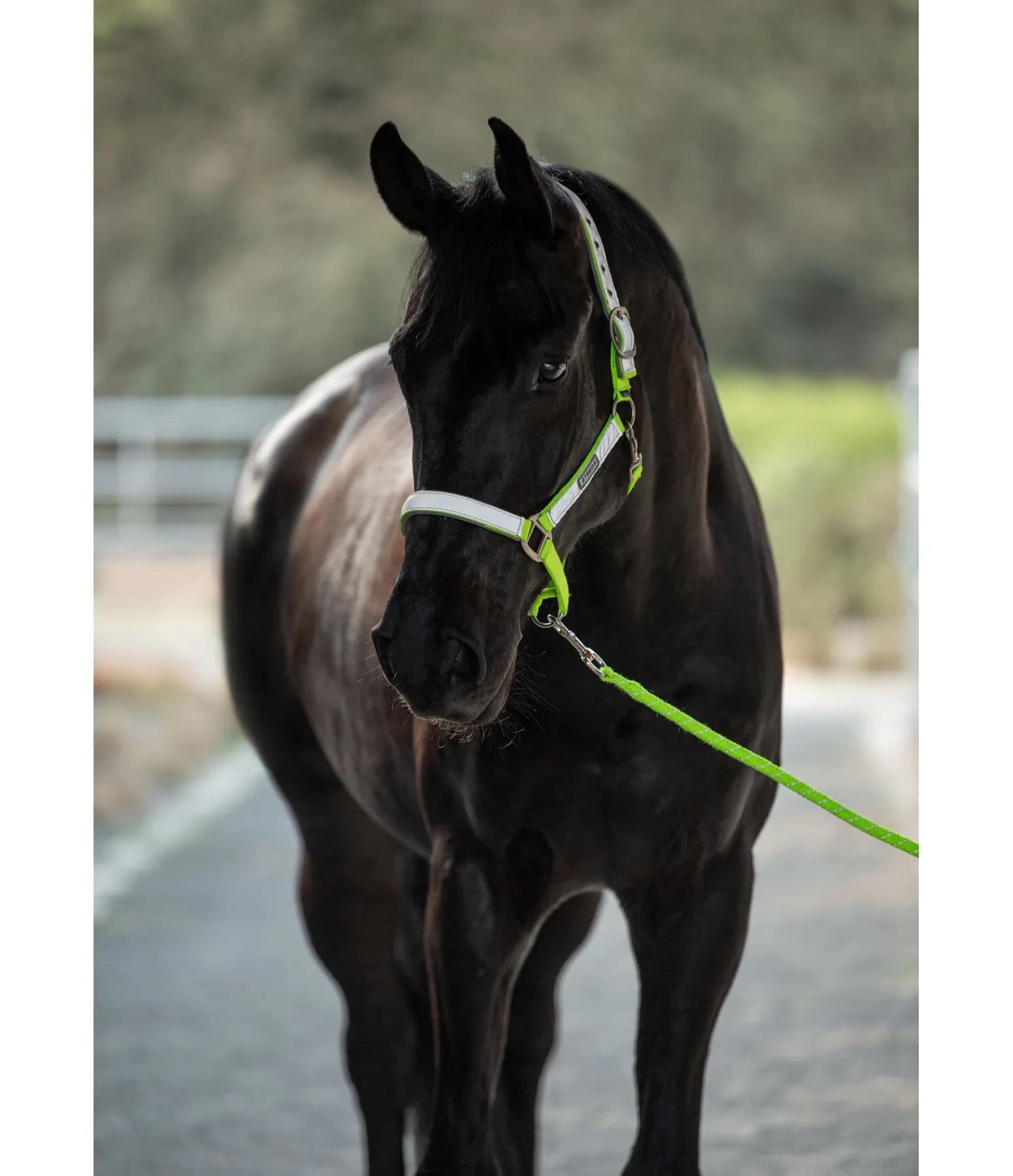 Licol en nylon avec doublure moelleuse et bandes réfléchissantes. Réglable à la têtière. Bouclerie argentée mat.