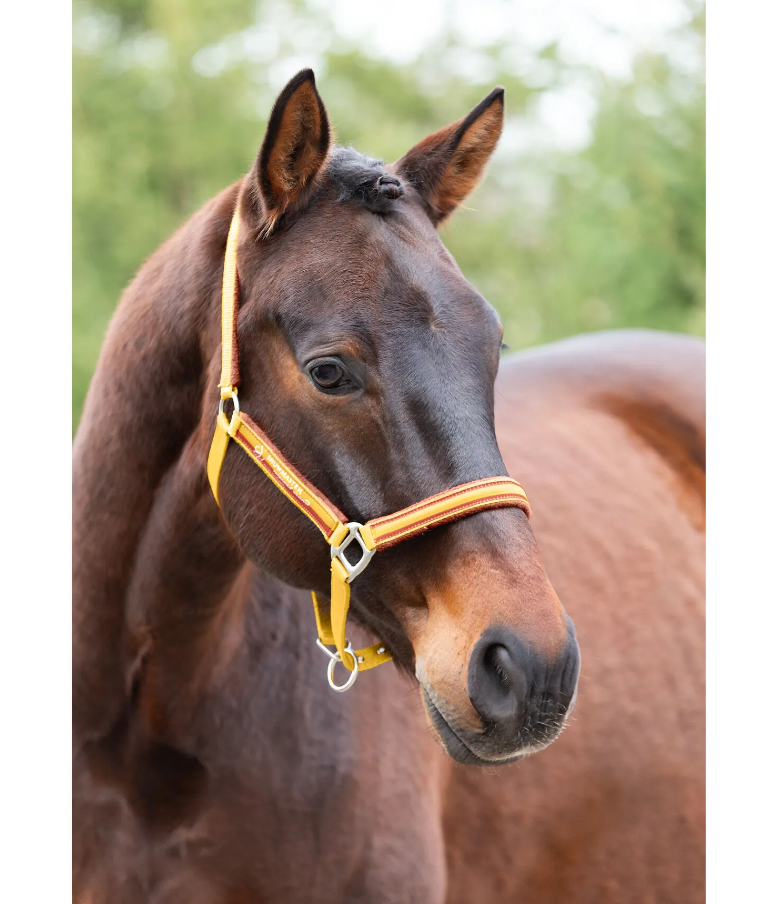 Licol simple bicolore. Têtière, montants et muserolle avec doublure douce en tissu éponge. Têtière et muserolle réglables. Bouclerie mate argentée. Licol 100 % polypropylène, doublure 100 % polyester.