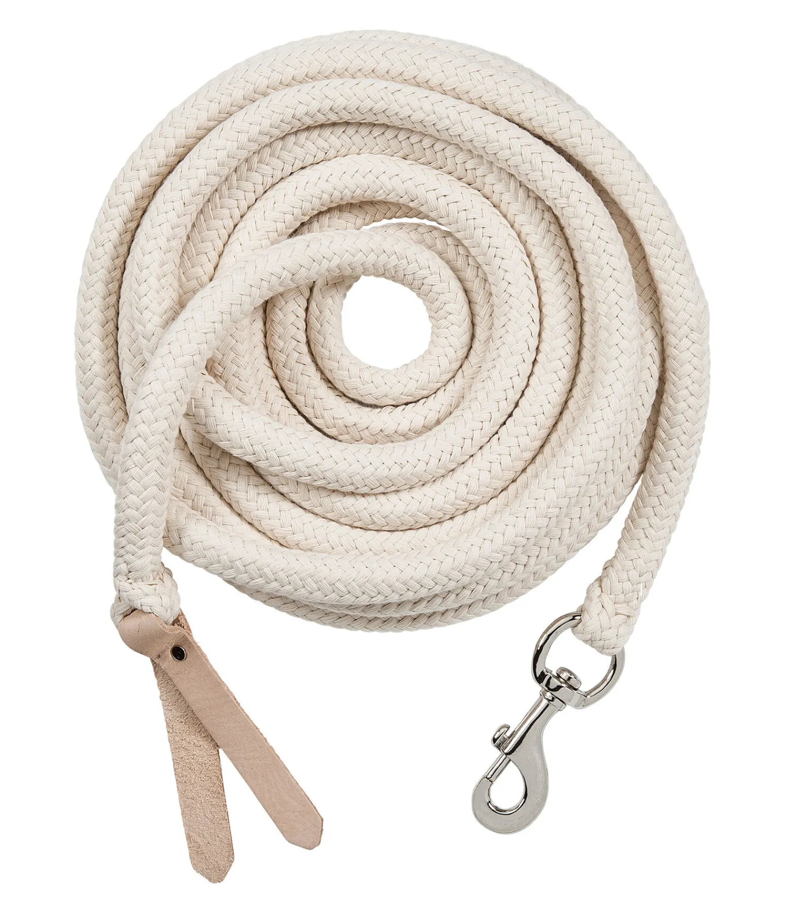 Très résistante grâce au lourd coeur en polyester. Gaine en coton naturel anti-dérapant. Avec Boltsnap et embout en cuir au bout de la longe. Disponible en 4 et 7 mètres.