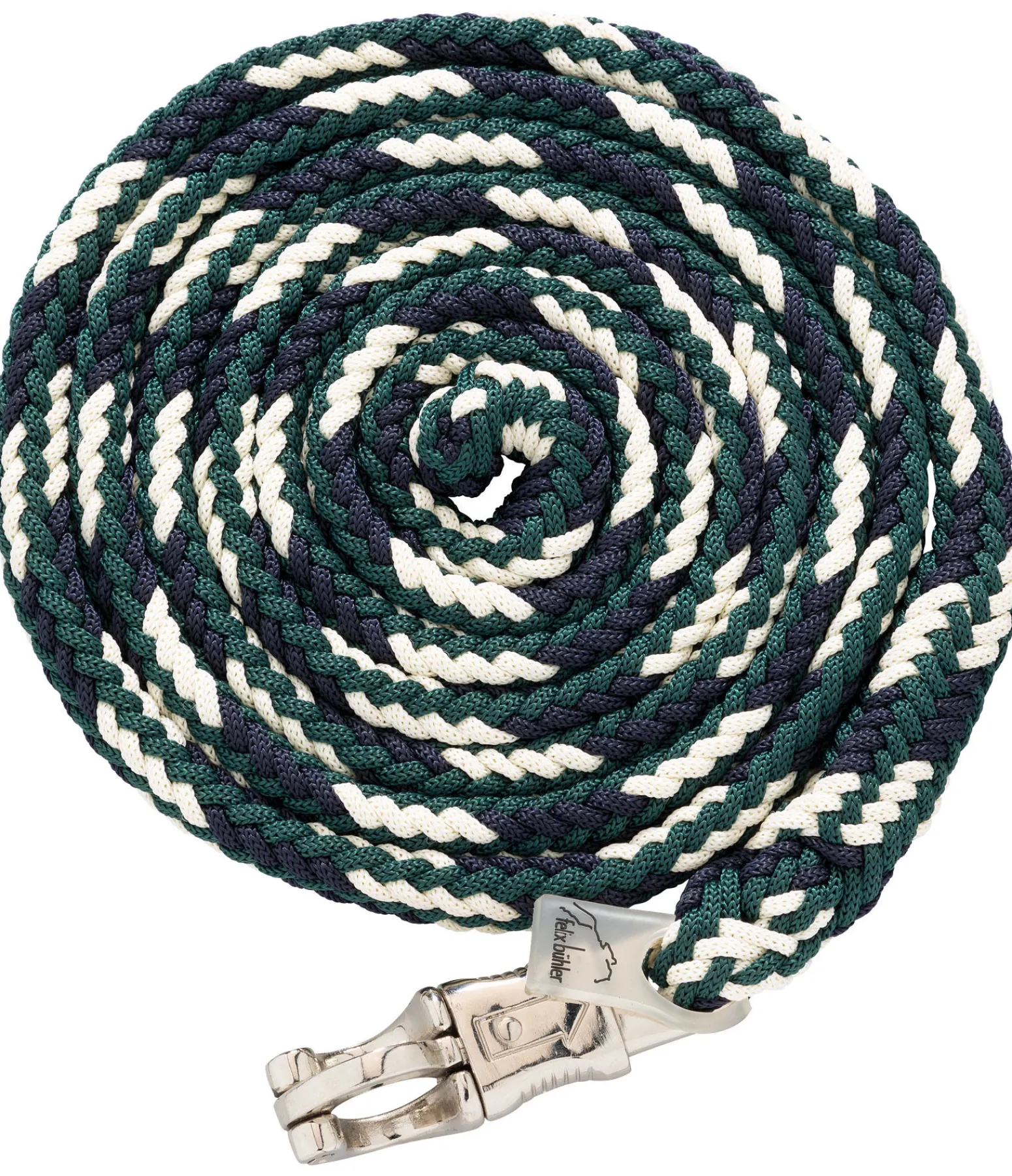 Longe tressée tricolore. Assortie au licol 440 830. Avec mousqueton anti-panique de couleur assortie. 2,2 m. 100 % polyester.