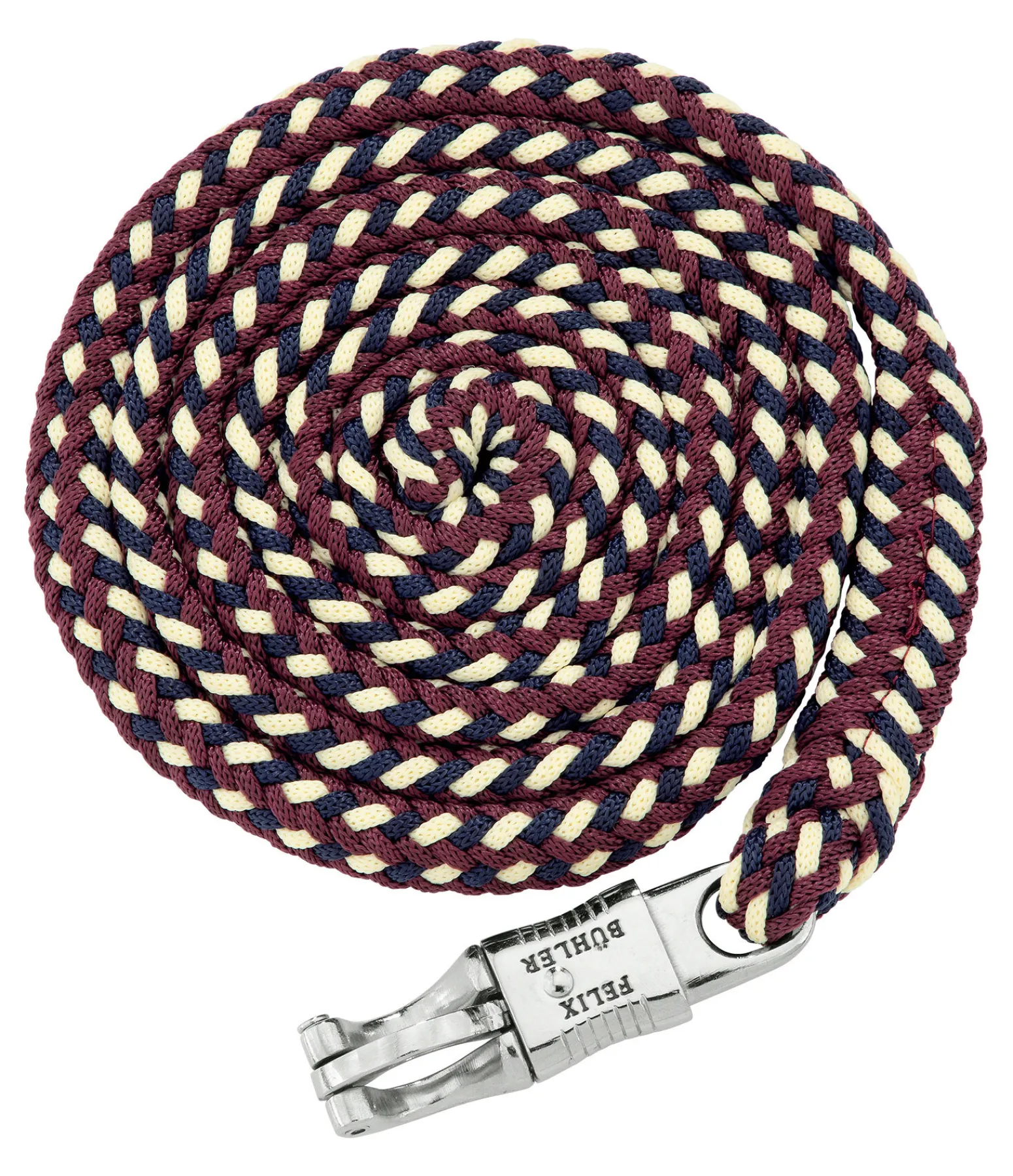 Longe tressée tricolore solide avec mousqueton anti-panique. 2 m. 100 % polyester. Assortie au licol 310056.