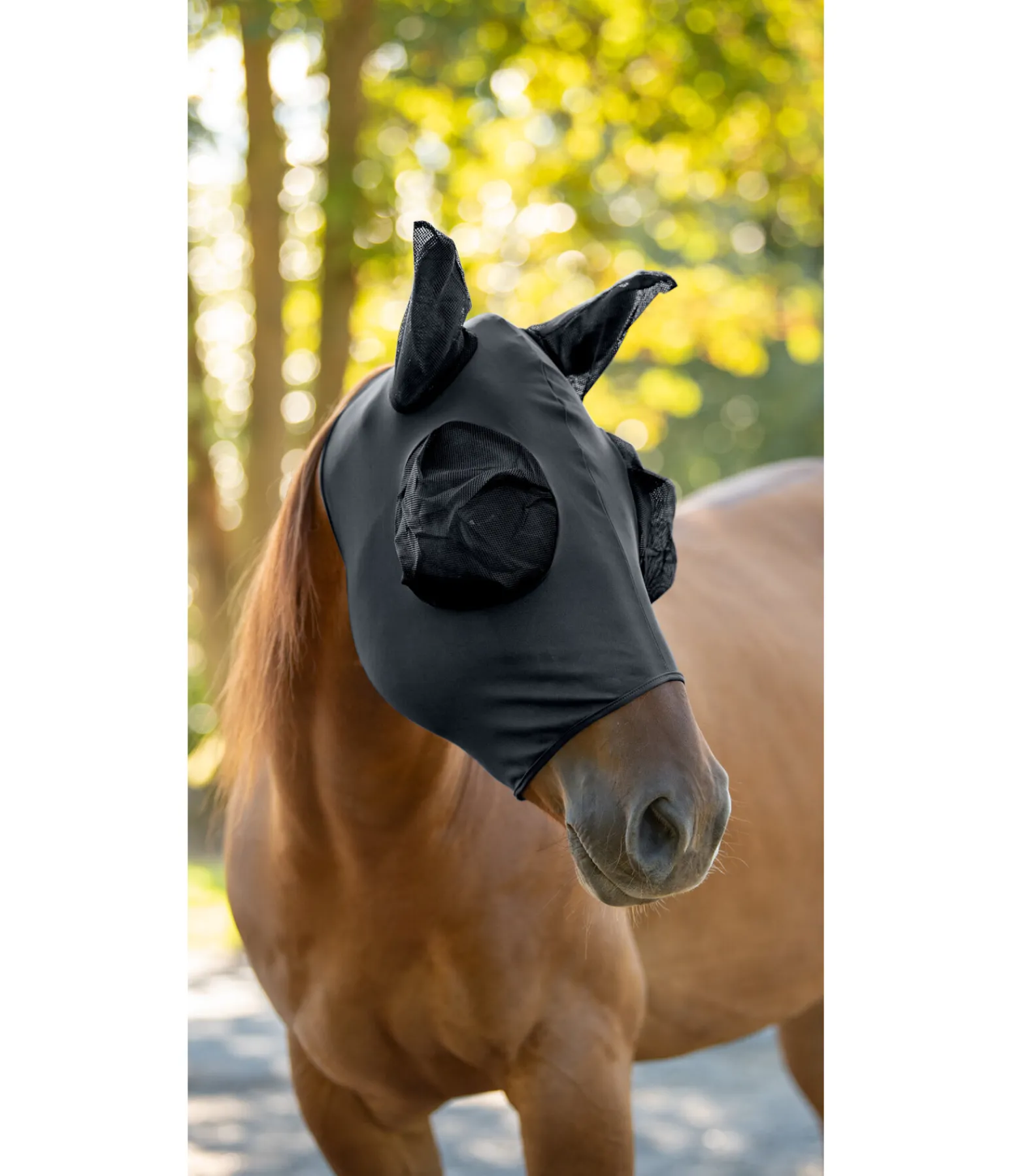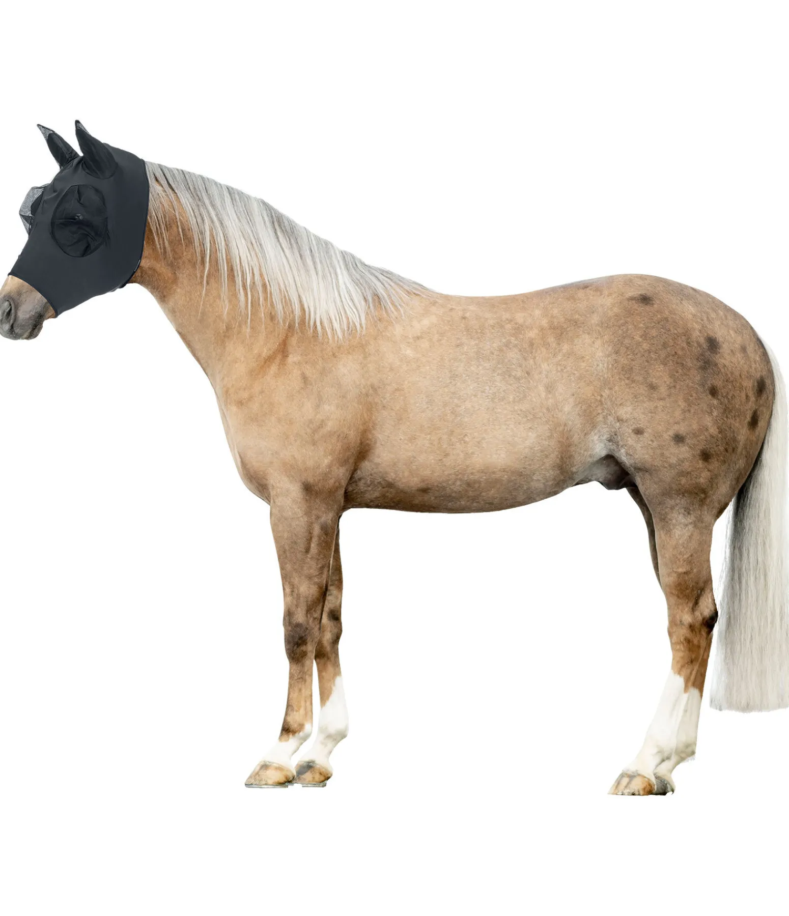 Masque anti-mouches en élasthanne lisse et extensible pour une adaptation parfaite à la tête du cheval. La matière en mailles aux yeux et aux oreilles assure une protection optimale contre les mouches. Grâce à la matière respirante, le cheval transpire moins qu’avec la plupart des autres masques. 85 % polyester, 15 % lycra.