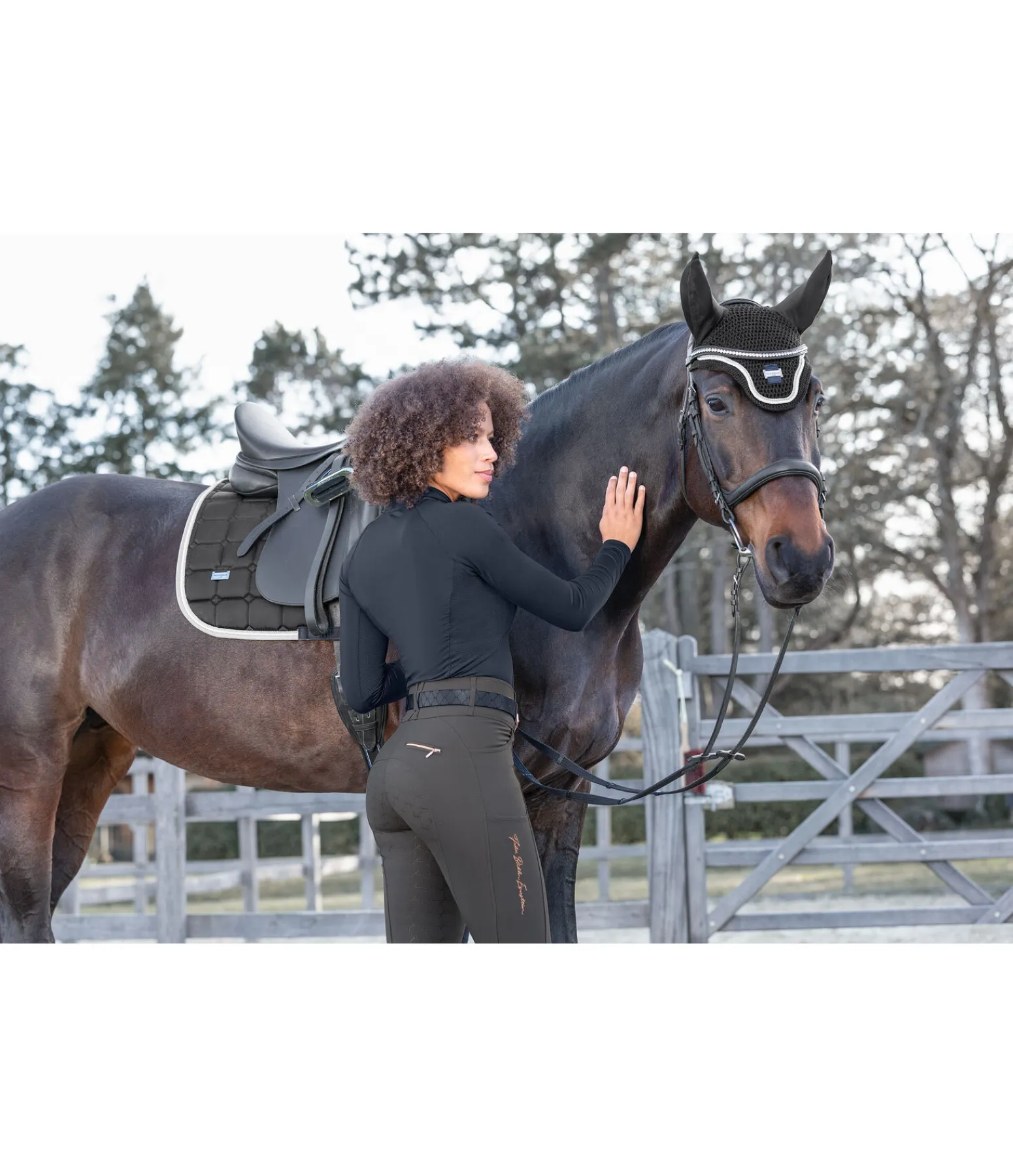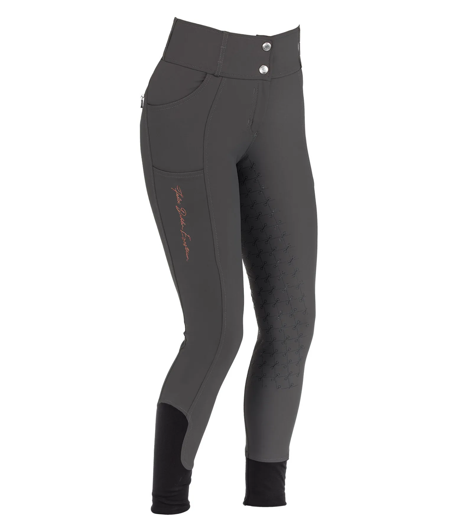 Pantalon d’équitation sportswear et extensible, à fond intégral grip en silicone avec motifs de mors. Matière déperlante, respirante et à séchage rapide. Broderie Felix Bühler sur la jambe. Poche arrière zippée et poche pour téléphone portable sur la cuisse. Deux poches avant. Ceinture à passants extra large élastiquée avec 2 boutons. Aucune couture aux genoux. Bas de jambe extensible en stretch. 89 % nylon, 11 % élasthanne.