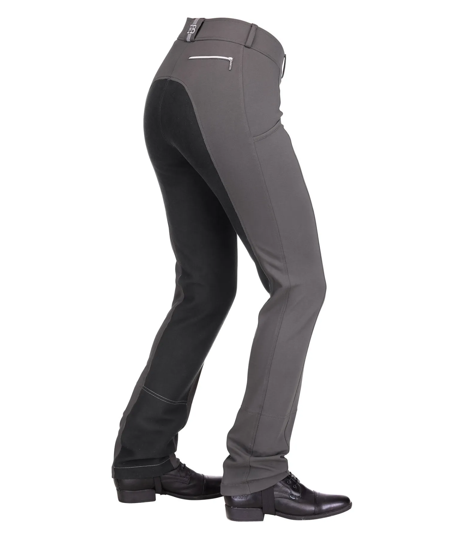 Pantalon d’équitation jodphur confortable. Fond intégral en synthétique. Large ceinture élastiquée avec deux boutons. Une poche zippée arrière et une poche pour téléphone portable sur la jambe. Broderie Felix Bühler à l’arrière. Bas de jambe évasé. Sous-pieds réglables. Matière très extensible et extrêmement douce. 68 % viscose, 27 % nylon, 5 % élasthanne.