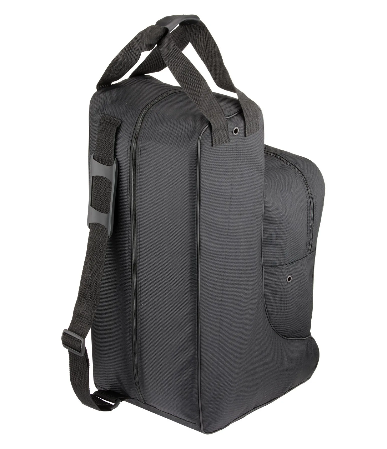 Sac pour bottes d’équitation en nylon résistant, avec compartiment rembourré pour le casque. Fentes d’aération, anse et bandoulière réglable incluses. Fond avec plotsi en caoutchouc résistants à l’usure. Fermeture à glissière double sens solide. 33 x 60 x 25 cm.