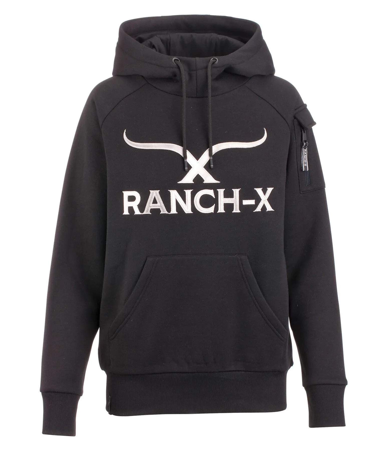 Sweat à capuche sportswear. Matière respirante. Logo RANCH-X en cuir sur la poitrine. Capuche ajustable par cordon de serrage. Poche kangourou. Poche zippée pratique sur la manche. Finition en bord-côte sur le bas des manches. 65 % coton, 35 % polyester.
