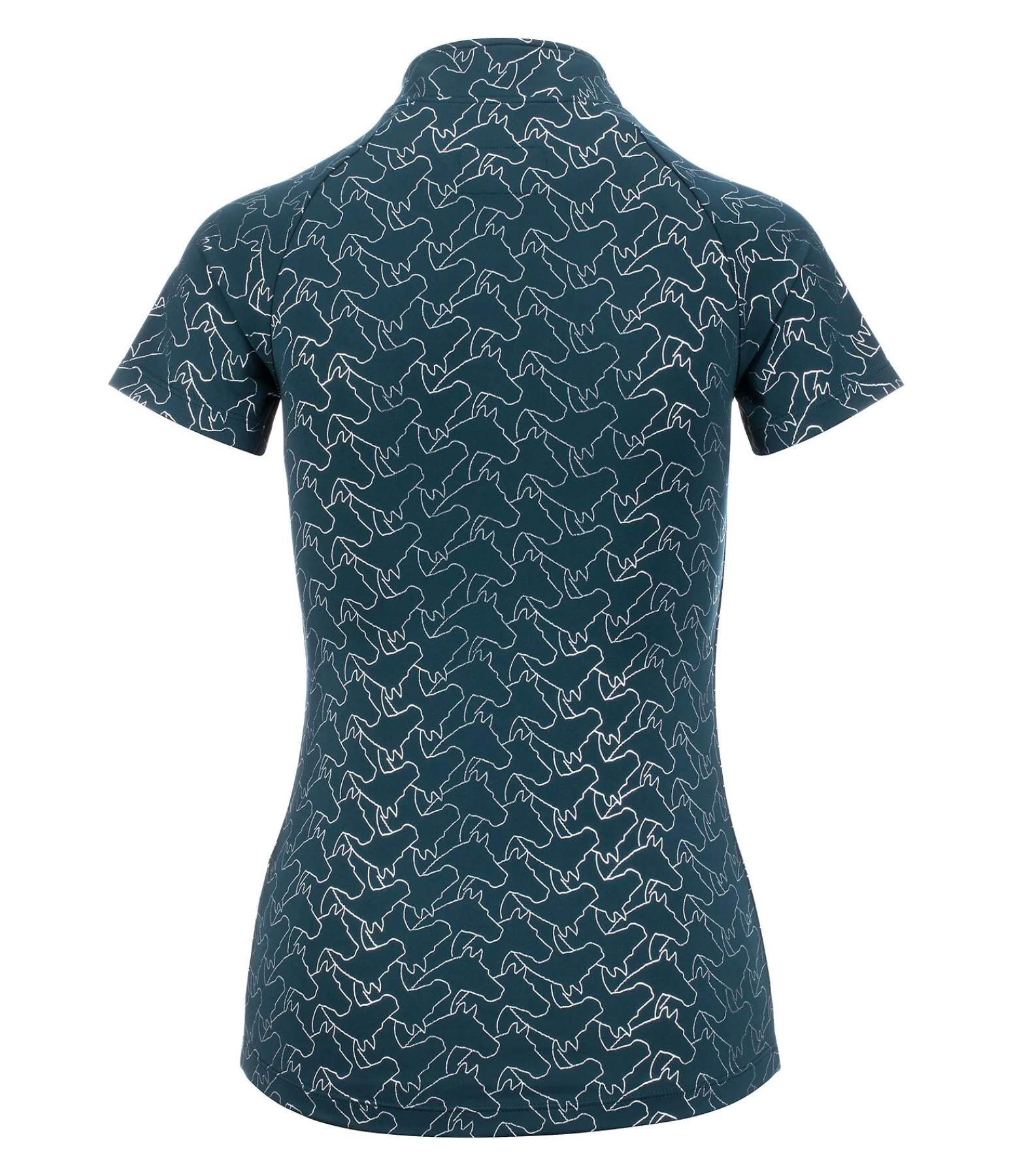 T-shirt chic et technique à manches courtes. Imprimé all-over métallisé motif tête de cheval. Manches raglan et petit col montant avec fermeture à glissière et protège-menton. Respirant et à séchage rapide. 88 % polyester, 12 % élasthanne.