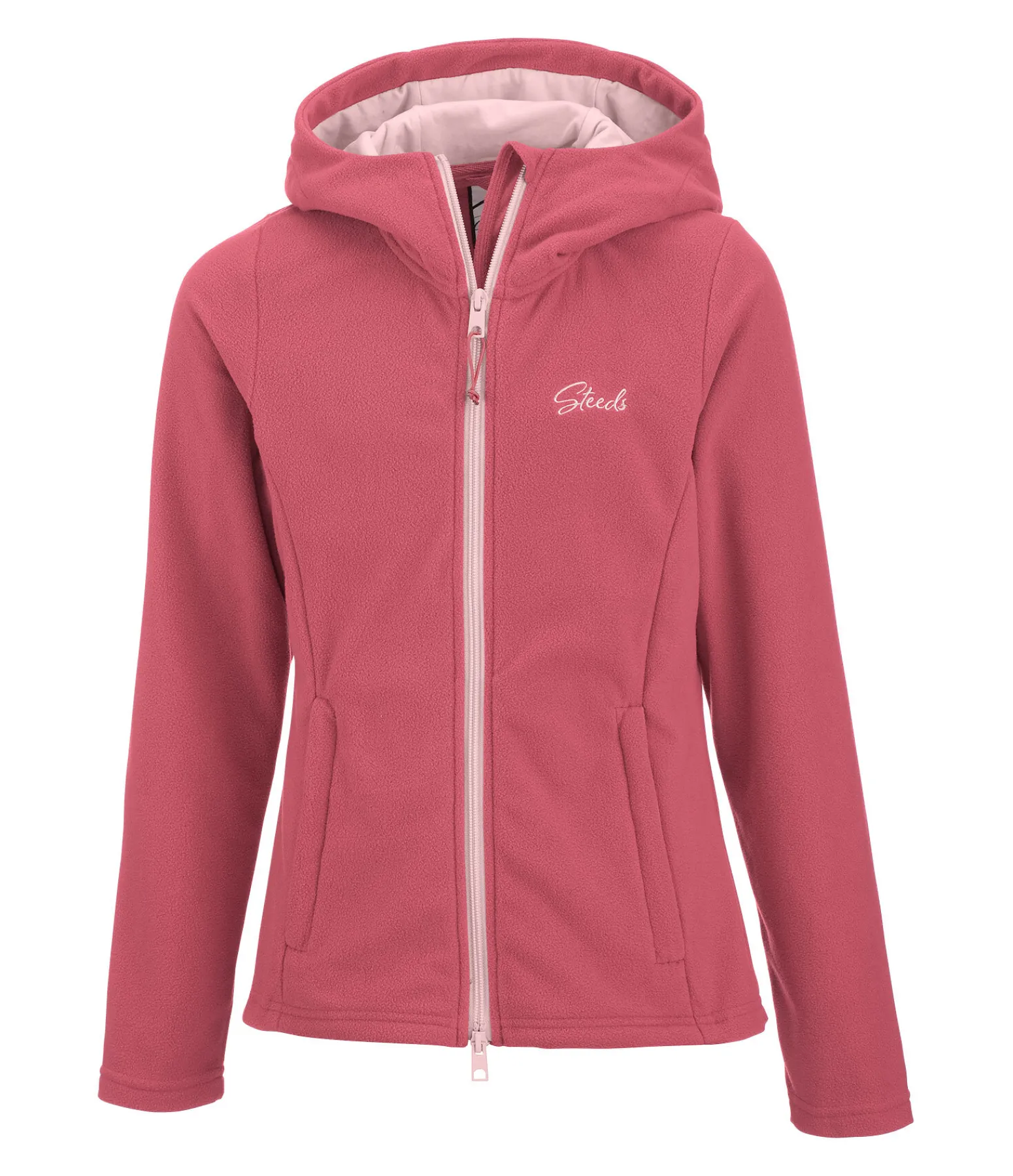 Veste polaire à capuche. Coupe légèrement plus longue à l’arrière. Fermeture à glissière bidirectionnelle de couleur contrastante avec protège-menton. Deux poches latérales zippées dissimulées. Logo STEEDS brodé sur la poitrine. Matière en polaire 100 % polyester, doublure de la capuche 95 % coton, 5 % élasthanne.