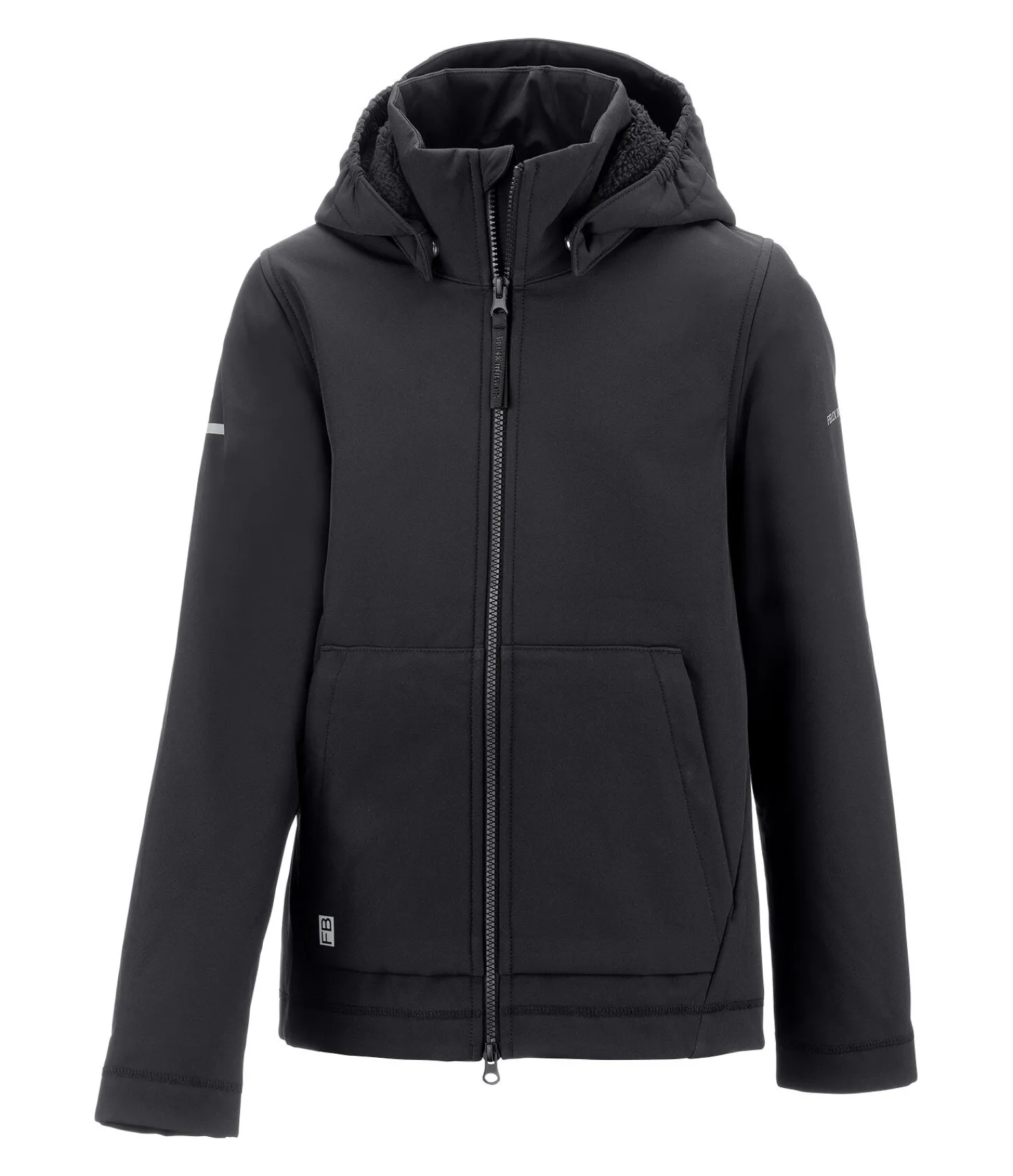 Veste softshell extensible à capuche dans un style sportswear. Coupe décontractée et doublure en polaire Teddy extra-douce. Déperlante, coupe-vent et respirante. Fermeture à glissière double sens, 2 poches avant zippées, capuche amovible, imprimé logo Felix Bühler sur la manche et la poche avant. 94 % polyester, 6 % élasthanne.