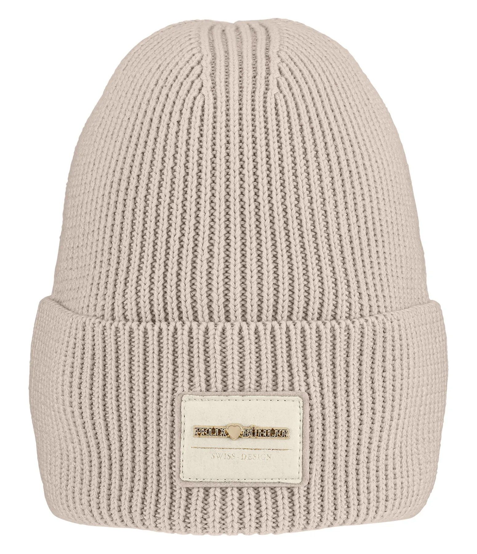 Bonnet chaud en maille côtelée tendance. Badge en relief avec logo doré. 100 % coton.