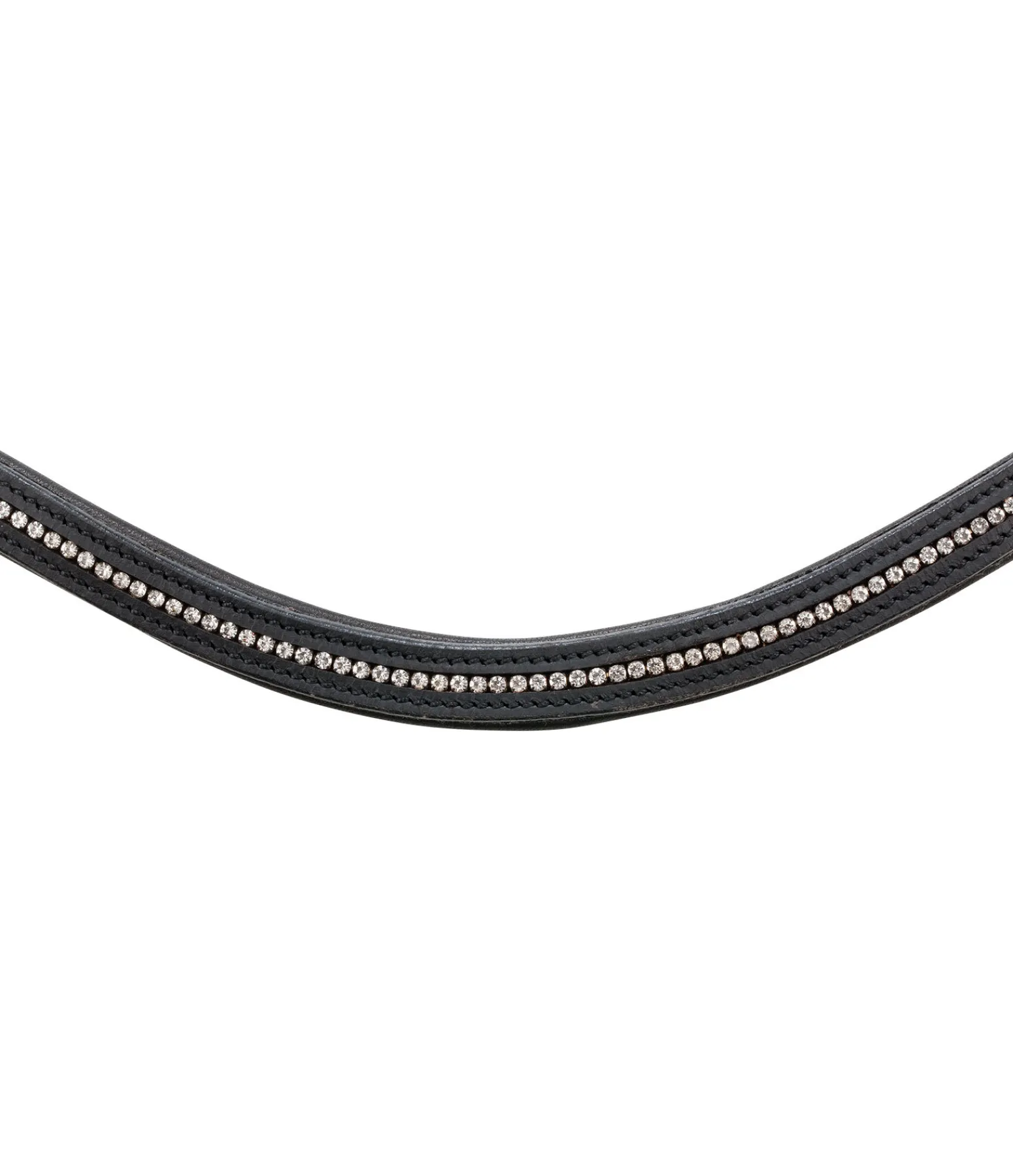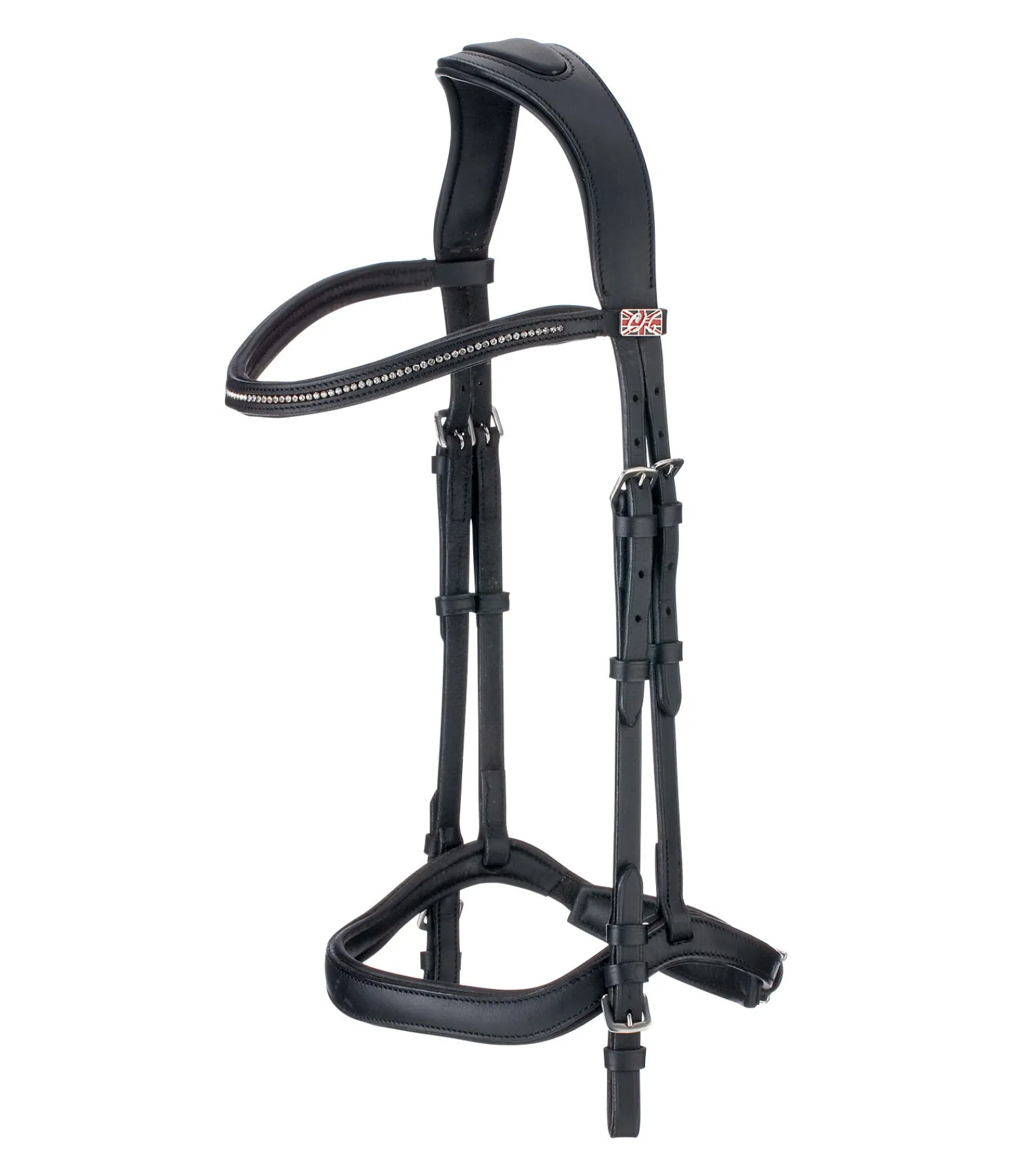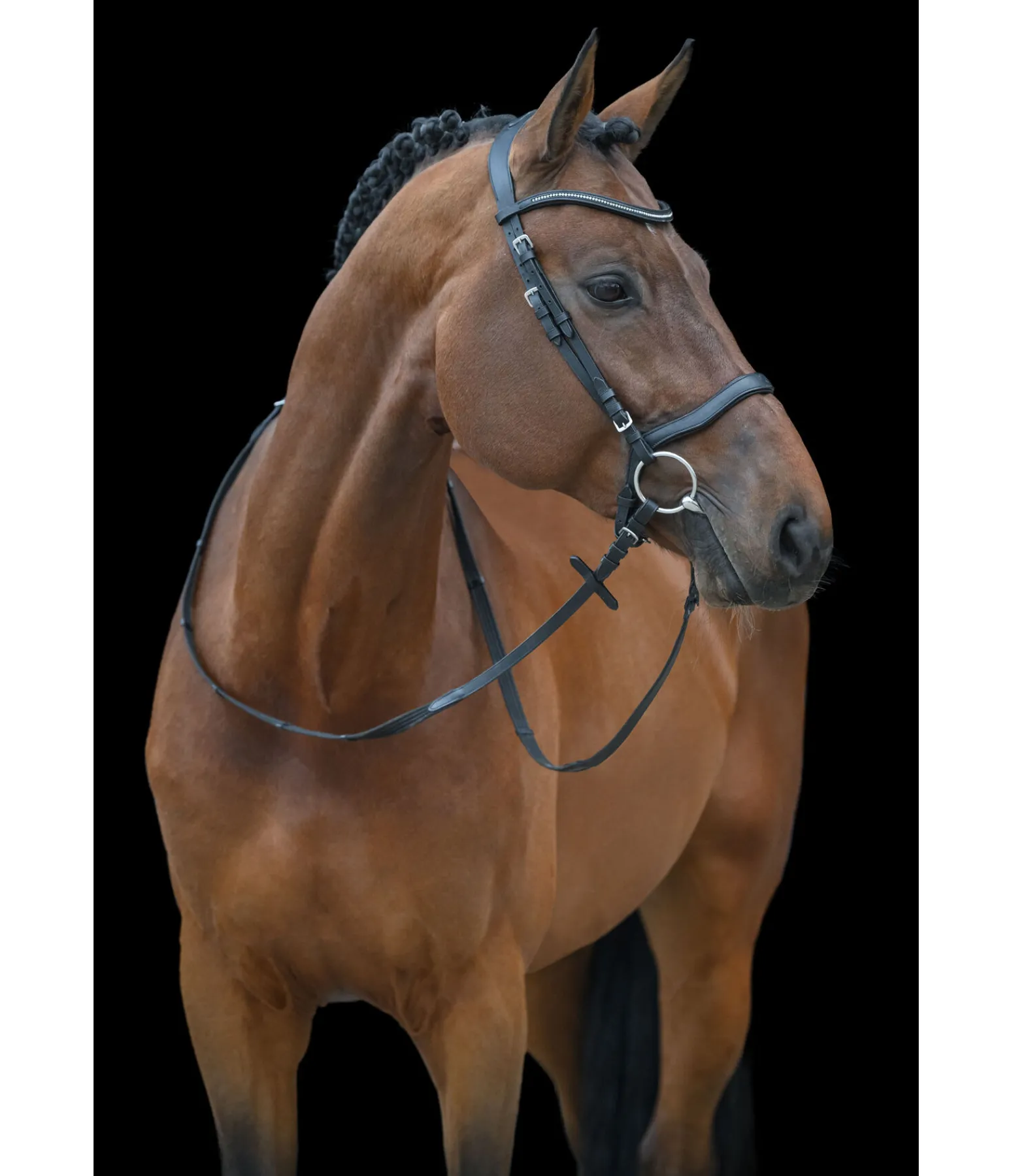 Bridon épuré avec têtière et muserolle anatomiques. Muserolle ergonomique permettant d’éviter les pressions sur les nerfs faciaux sensibles, au niveau des zygomatiques ainsi que sur la mâchoire et les dents. Doublure douce en cuir véritable. Sans noseband ni sous-gorge pour favoriser la mastication. Frontal vague classique avec strass. Bouclerie argentée. Rênes et mors non inclus.