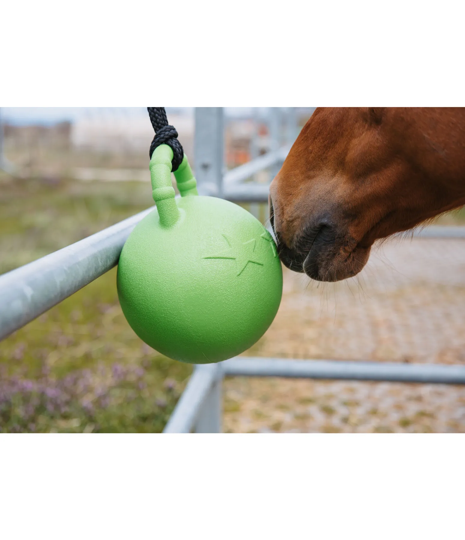 Balle de jeu pour cheval en matériau résistant et durable, décorée de moulages étoiles. Poignée particulièrement solide. Pas besoin de pompe ! La valve spéciale permet à l’air de s’évacuer lorsque le cheval mord la balle puis à la balle de se remplir d’air toute seule. Ø 26 cm.