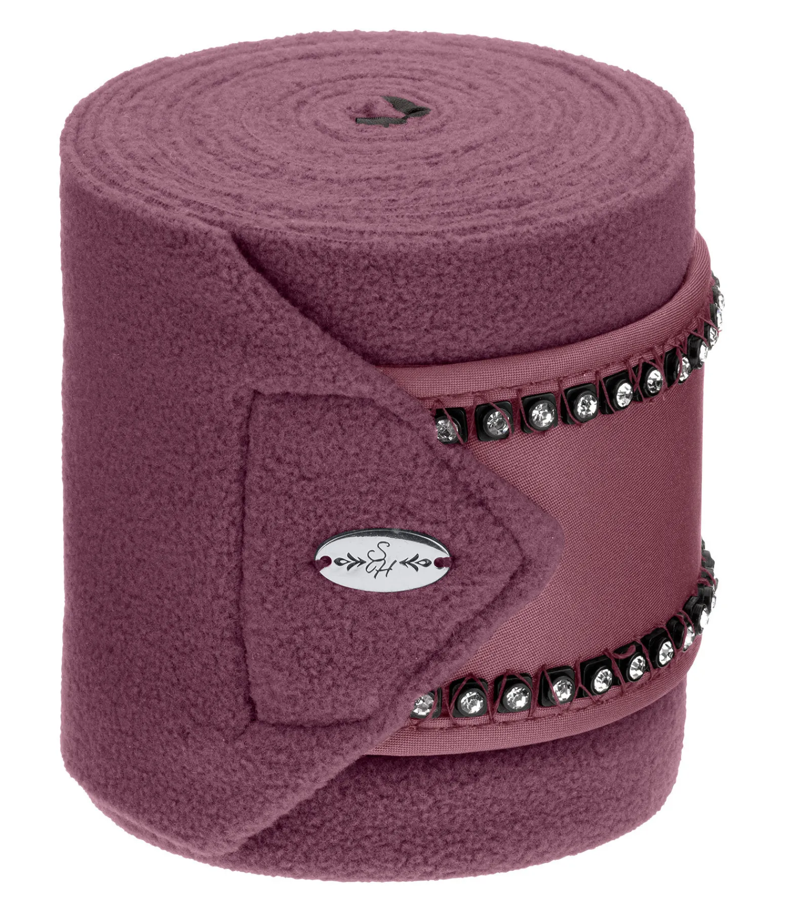 Bandes de polo en polaire. Passepoil avec strass sur la fermeture des bandes. Patte auto-agrippante pour un maintien sûr. 100 % polyester. F (cheval) : 300 x 10 cm, P (poney) : 200 x 8 cm. Vendues par lot de 4.