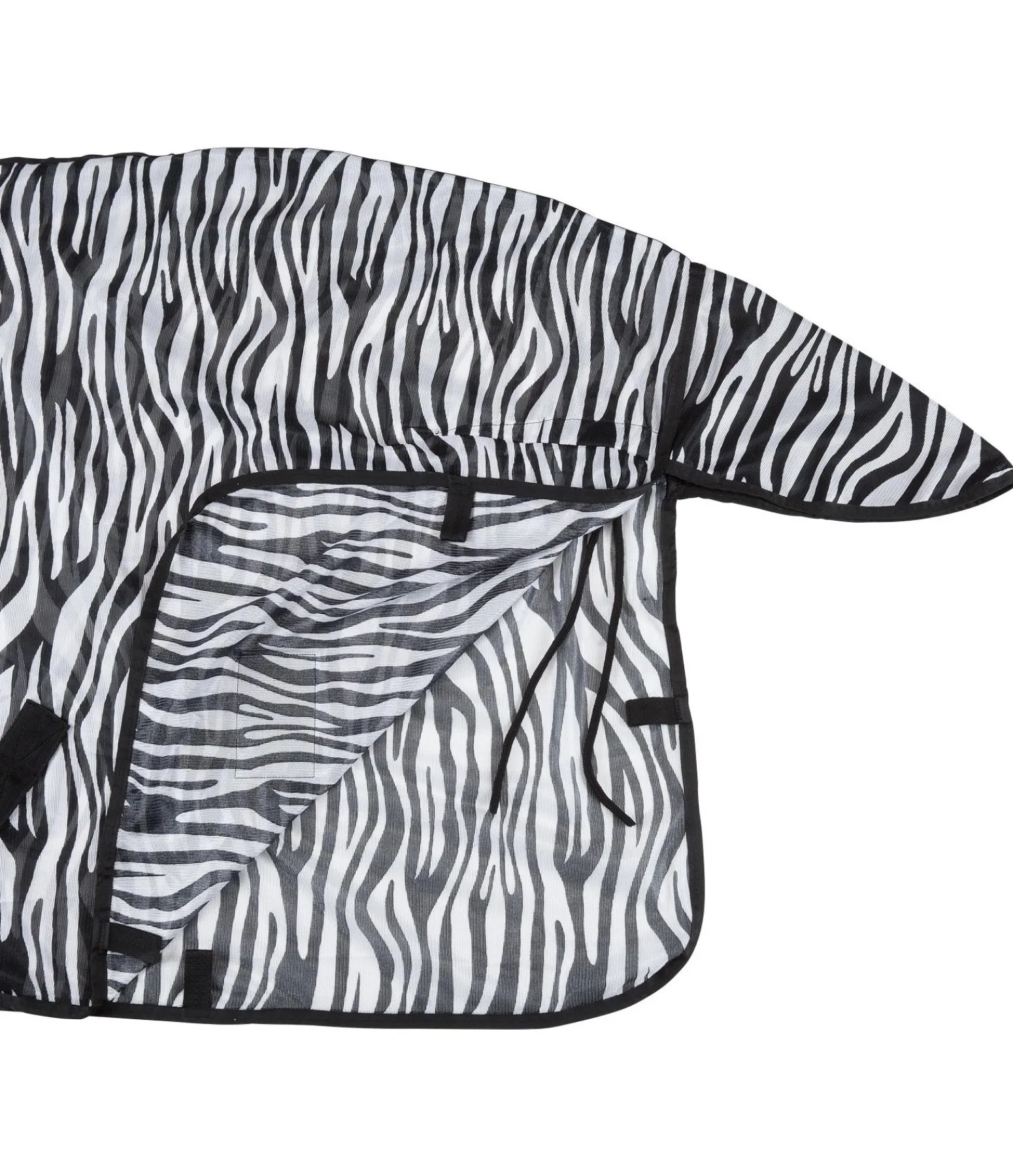 Chemise anti-mouches classique au look zèbre. Les motifs noir et blanc rendent les insectes incertains et les tiennent éloignés des chevaux. Double fermeture de poitrail. Plis d’aisance, rabat de queue et sursangles croisées. Doublure en nylon au niveau du poitrail pour limiter les frottements et la perte de poils. 100 % polyester.