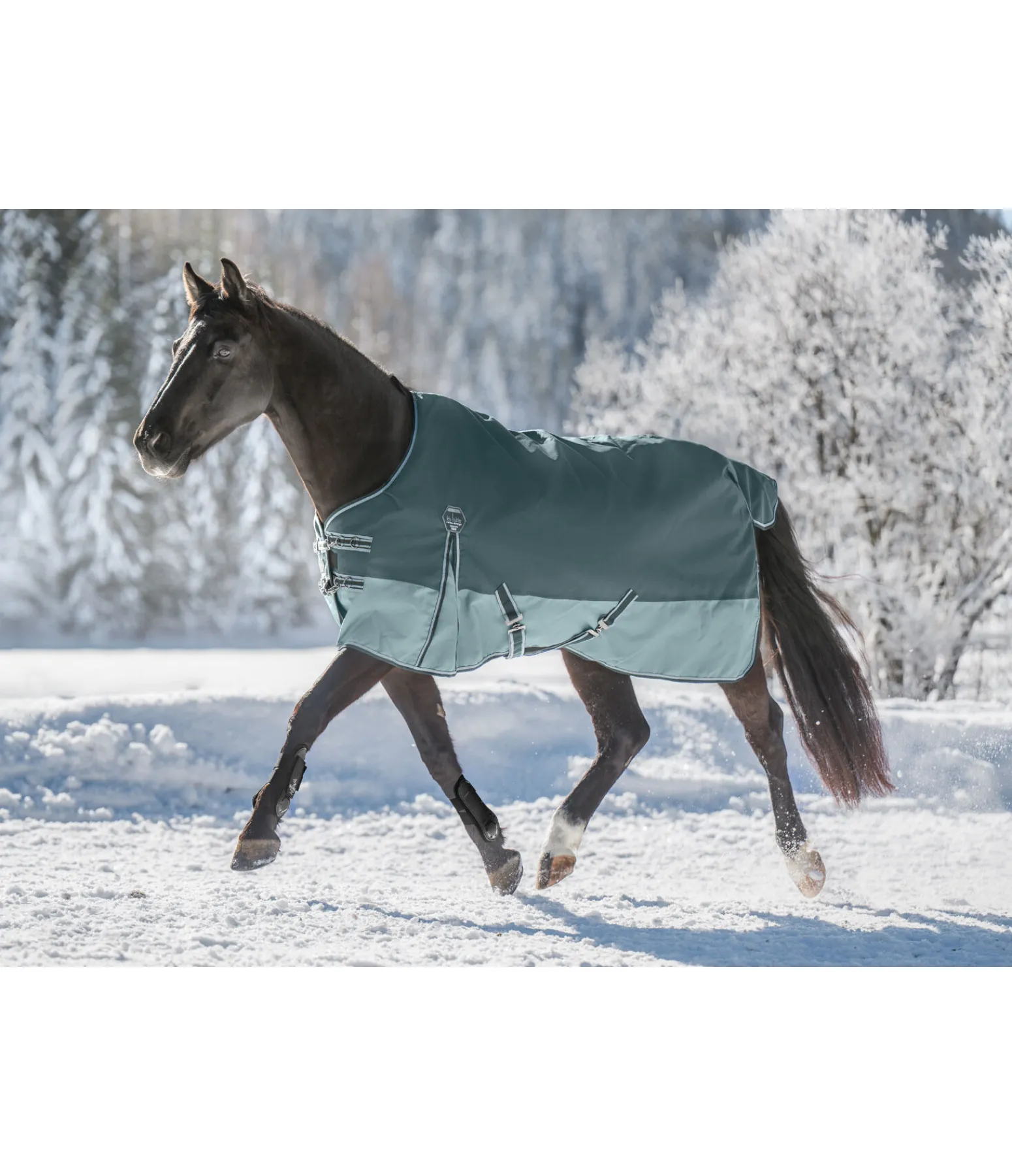Couverture d’extérieur bicolore résistante et imperméable (3 000 mm) en matière Ripstop solide (1 200 deniers). Coussins au niveau du garrot pour le protéger et éviter les pressions. Garnissage 50 g léger. Doublure lisse protégeant la robe. Double fermeture de poitrail réglable avec mousquetons et patte auto-agrippante supplémentaire pour un maintien sûr. Grands plis d’aisance pour une liberté de mouvement optimale. Sursangles croisées, anneaux permettant de fixer des courroies de cuisses (non incluses) et courroie de queue réglable. 100 % polyester.