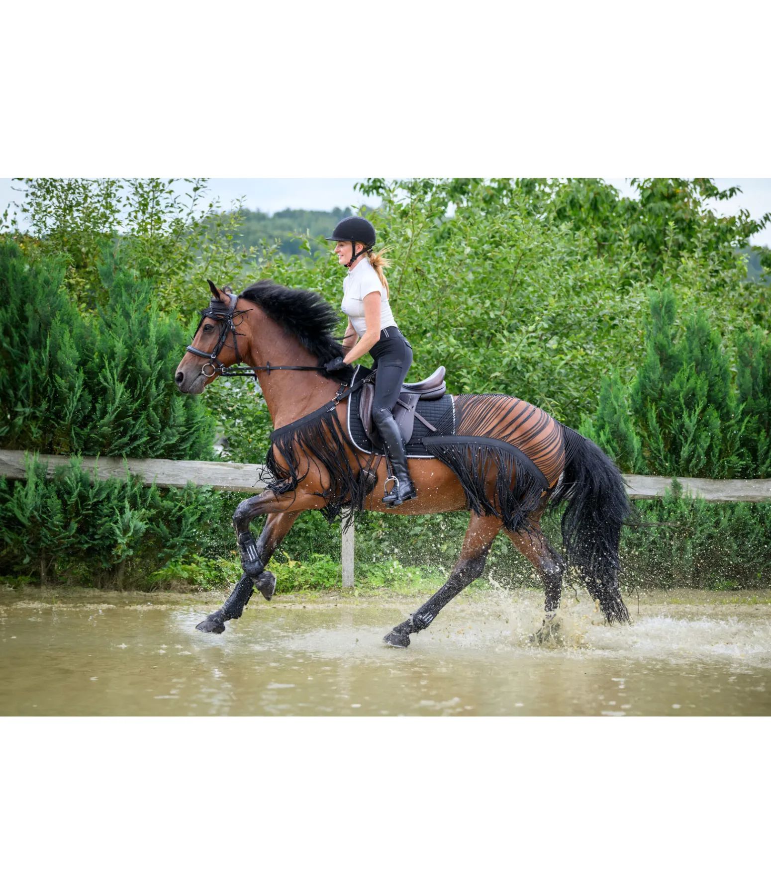 Couvre-reins innovant avec franges anti-mouches au niveau de la croupe et des flancs pour des sorties en toute tranquillité, pour le travail au sol ou pour le travail à la longe. Sangle élastiquée réglable pour fixation par patte auto-agrippante aux oeillets de la selle ou du surfaix. Alternative légère et parfaite à la couverture anti-mouche. Peut être utilisé seul ou assorti au collier de chasse anti-mouches SHOWMASTER pour une protection complète contre les mouches et autres nuisibles. 100 % polyester.